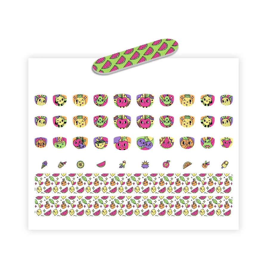 Contém: 30 autocolantes para unhas + 10 autocolantes mais pequenos + 1 tira de padrões para recortar + 1 lima de unhas
