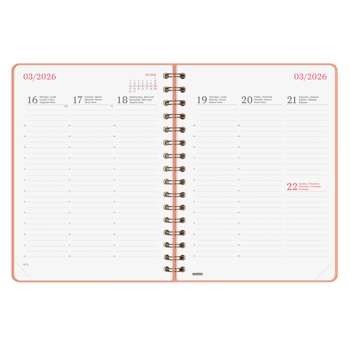 Semelhante ao formato DIN A5; com as vantagens de um planejador portátil e de mesa.