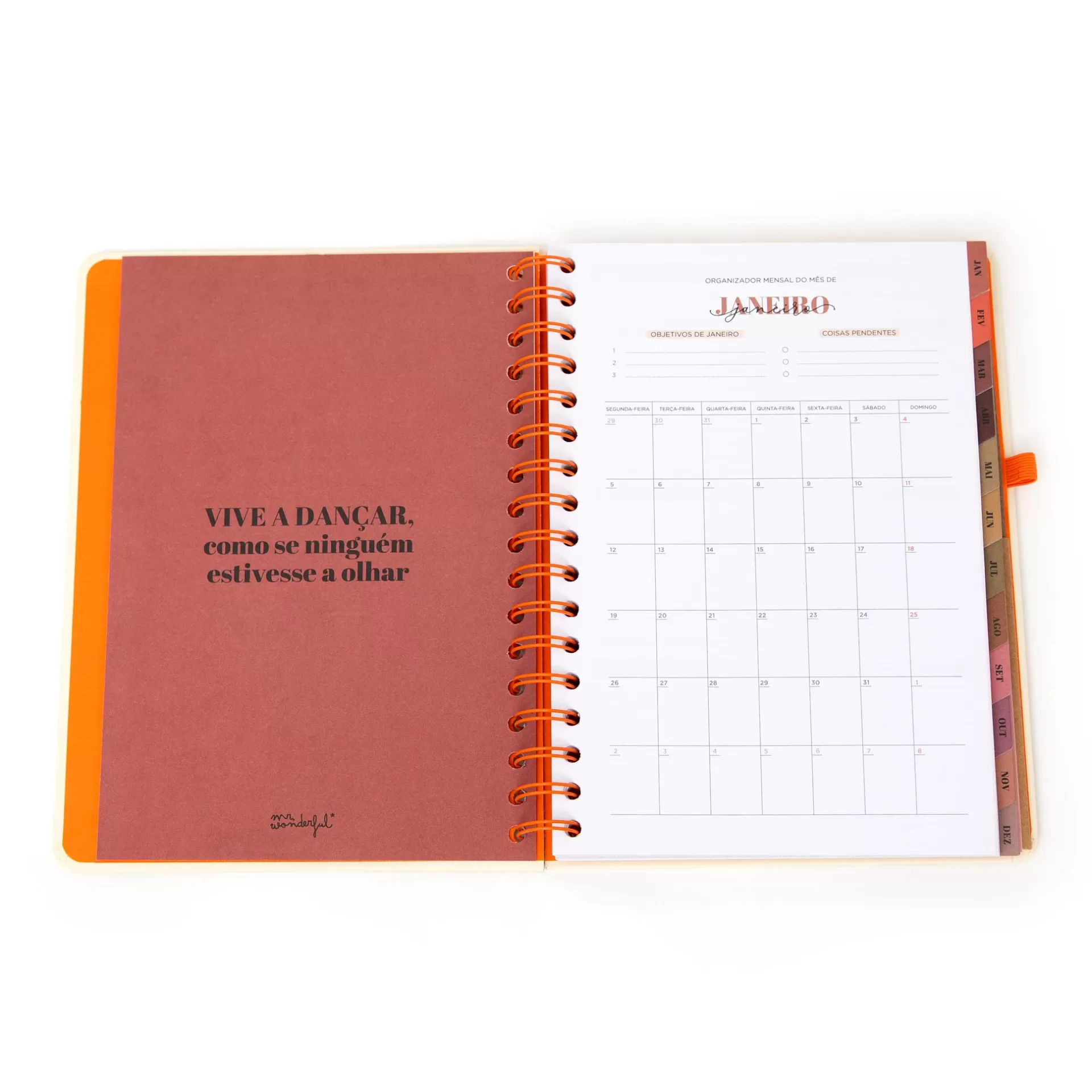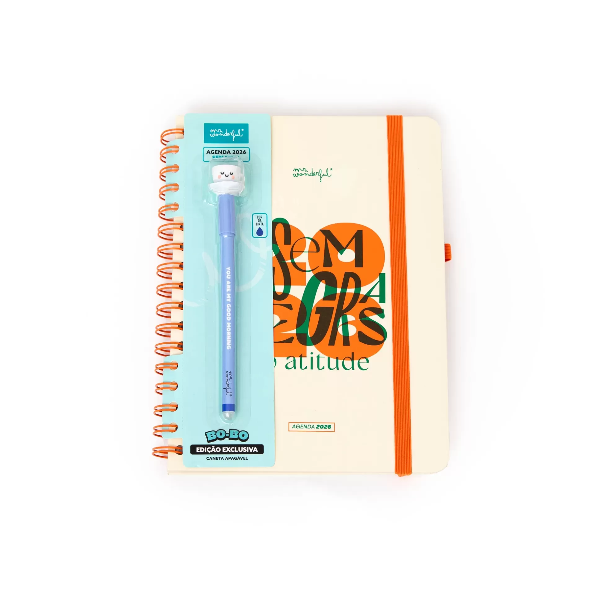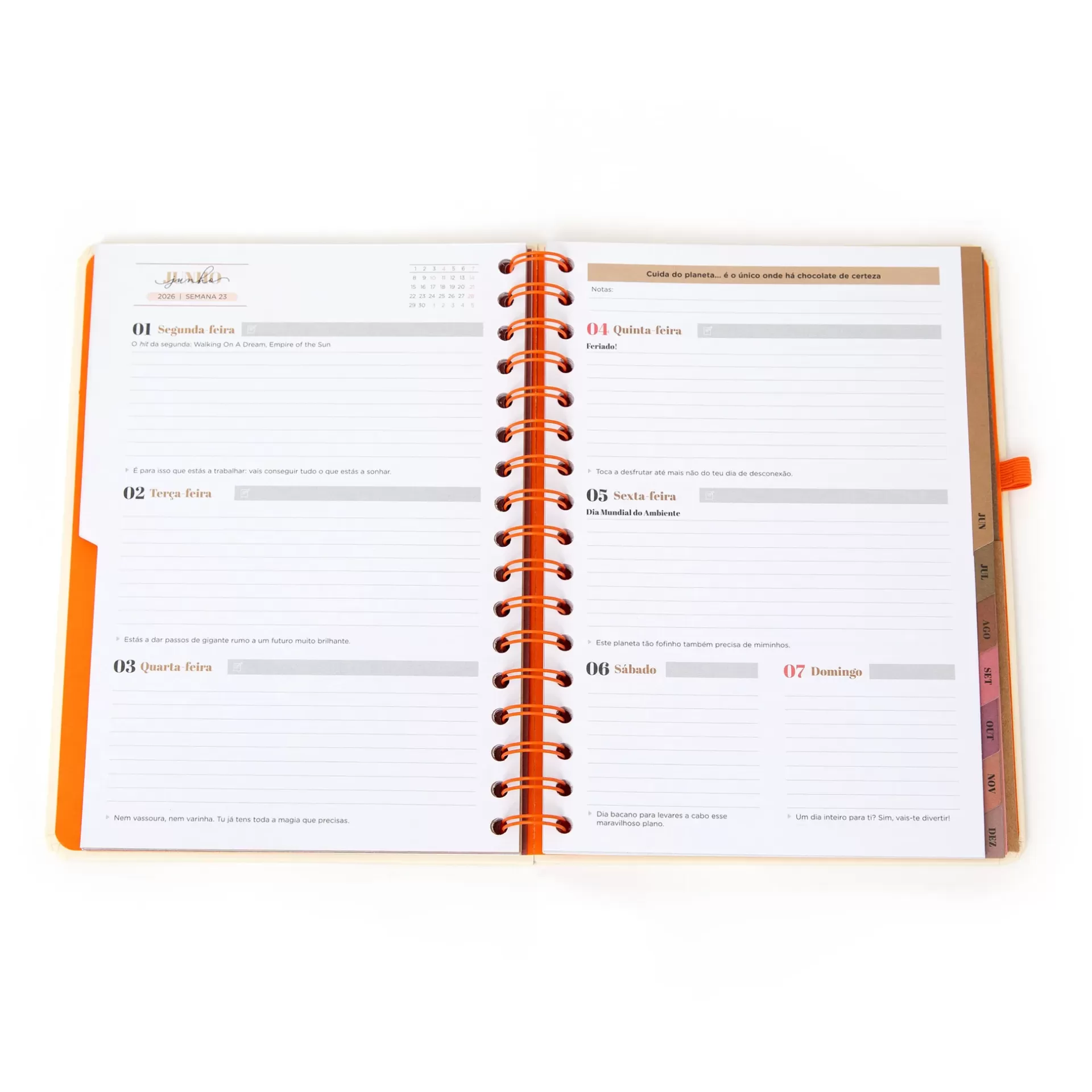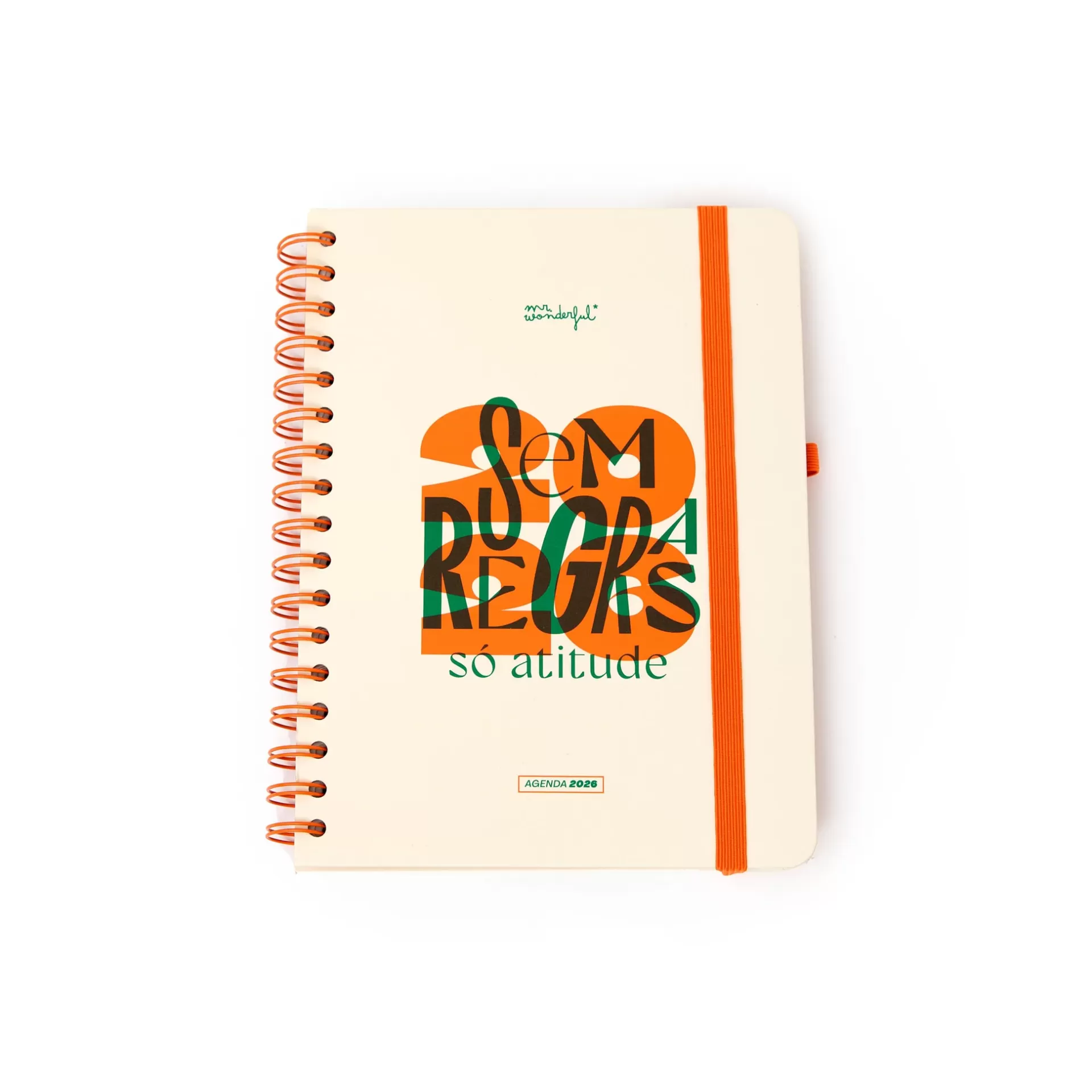 Agenda estilo Office da Mr. Wonderful, um tipo de desenho um pouco mais sóbrio e contido do que o nosso estilo mais clássico, pelo que será do agrado de um público mais velho. Com organização semanal, vai de janeiro a dezembro de 2026. Esta agenda contém: · 160 páginas de papel de 100gsm com a certificação FSC · Frases diárias motivacionais · Separadores com aba por cada mês · Compartimento interior de cartão · Régua de plástico interior · 8 folhas de autocolantes · Horários e calendários de 2026 e 2027 · Playlist exclusiva · Páginas para apontar contactos · Tabelas de poupança · Fecho com elástico · Organizador mensal no início de cada mês · Blocos de notas adesivas com formas · Frases mensais supermotivadoras · Elástico lateral para prender uma caneta