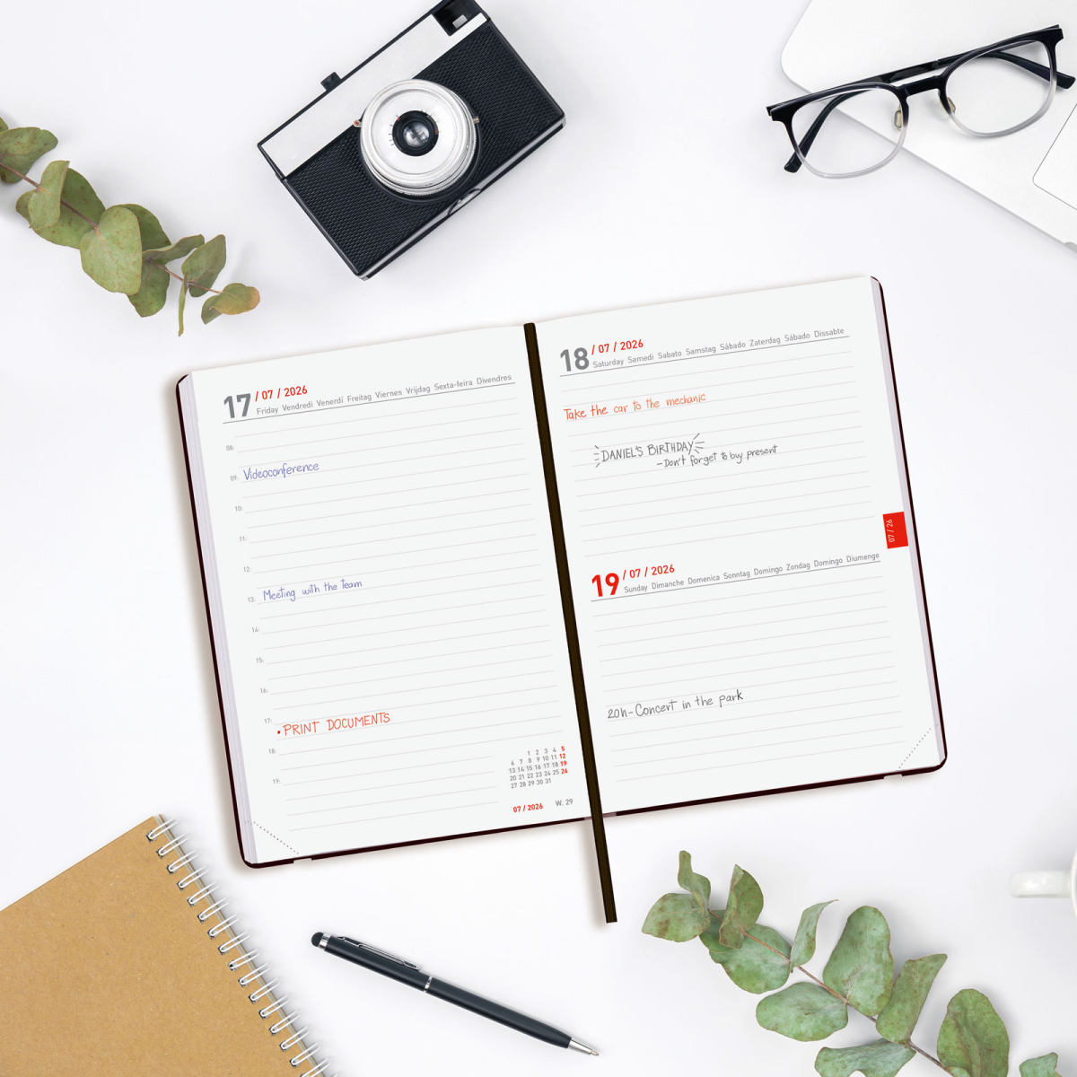 Agenda com capa flexível para 18 meses: começa em julho de 2025 e termina em dezembro de 2026. Perfeita para planejamento a longo prazo. As capas flexíveis são confortáveis ​​de segurar e abrem facilmente para uma escrita confortável. Com fita pontilhada e elástico. Os cantos são microperfurados para rápida identificação da semana atual. Para facilitar a localização de cada mês, a agenda possui um indicador no lado direito das páginas. Esta agenda inclui informações úteis e outros extras.