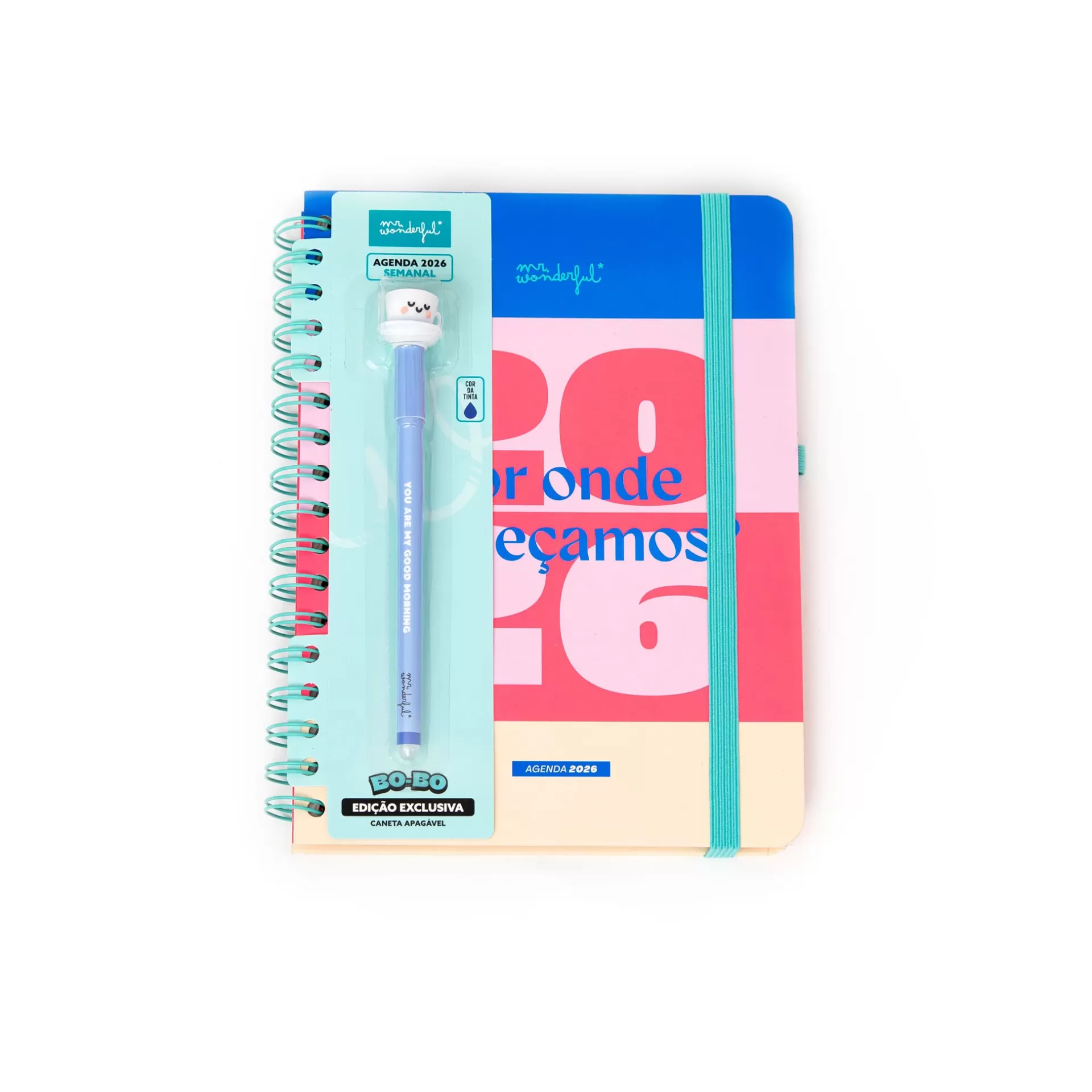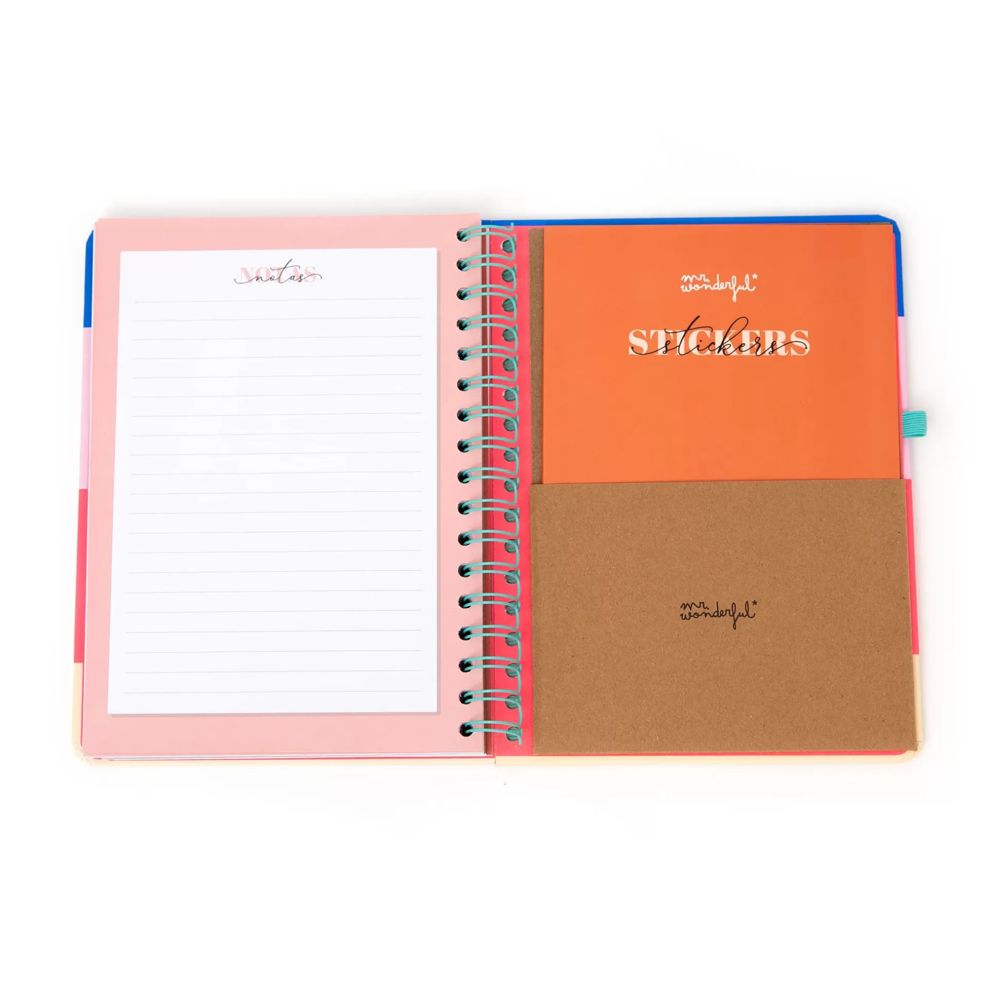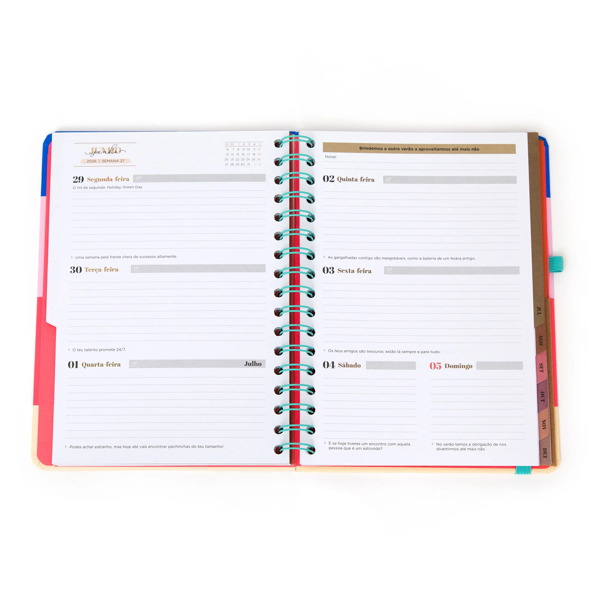 Agenda estilo Office da Mr. Wonderful, um tipo de desenho um pouco mais sóbrio e contido do que o nosso estilo mais clássico, pelo que será do agrado de um público mais velho. Com organização semanal, vai de janeiro a dezembro de 2026. Esta agenda contém: · 160 páginas de papel de 100gsm com a certificação FSC · Frases diárias motivacionais · Separadores com aba por cada mês · Compartimento interior de cartão · Régua de plástico interior · 8 folhas de autocolantes · Horários e calendários de 2026 e 2027 · Playlist exclusiva · Páginas para apontar contactos · Tabelas de poupança · Fecho com elástico · Organizador mensal no início de cada mês · Blocos de notas adesivas com formas · Frases mensais supermotivadoras · Elástico lateral para prender uma caneta