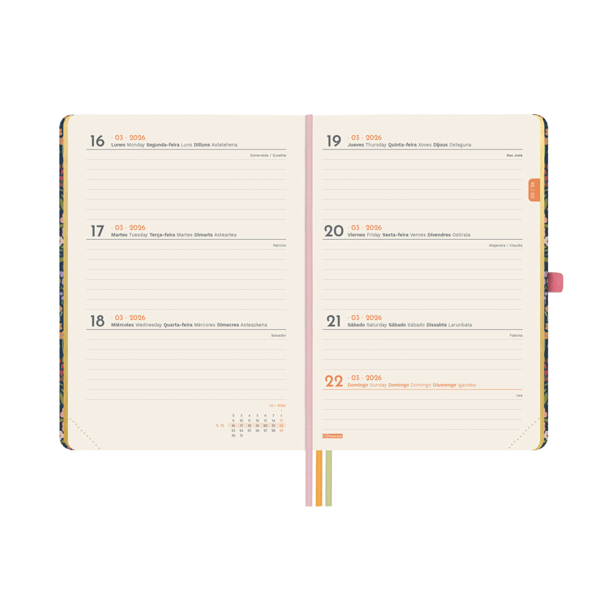 Agenda de capa dura com design moderno e moderno. Abertura perfeita para uma escrita confortável. Com fita de bolinhas, elástico e alça para caneta, para levar sempre consigo um instrumento de escrita. Bolso interno reforçado em papel trançado resistente. Cantos microperfurados para rápida identificação do dia/semana atual. Para facilitar a localização de cada mês, a agenda anual inclui um indicador no lado direito das páginas. A agenda anual contém informações úteis e outros extras.