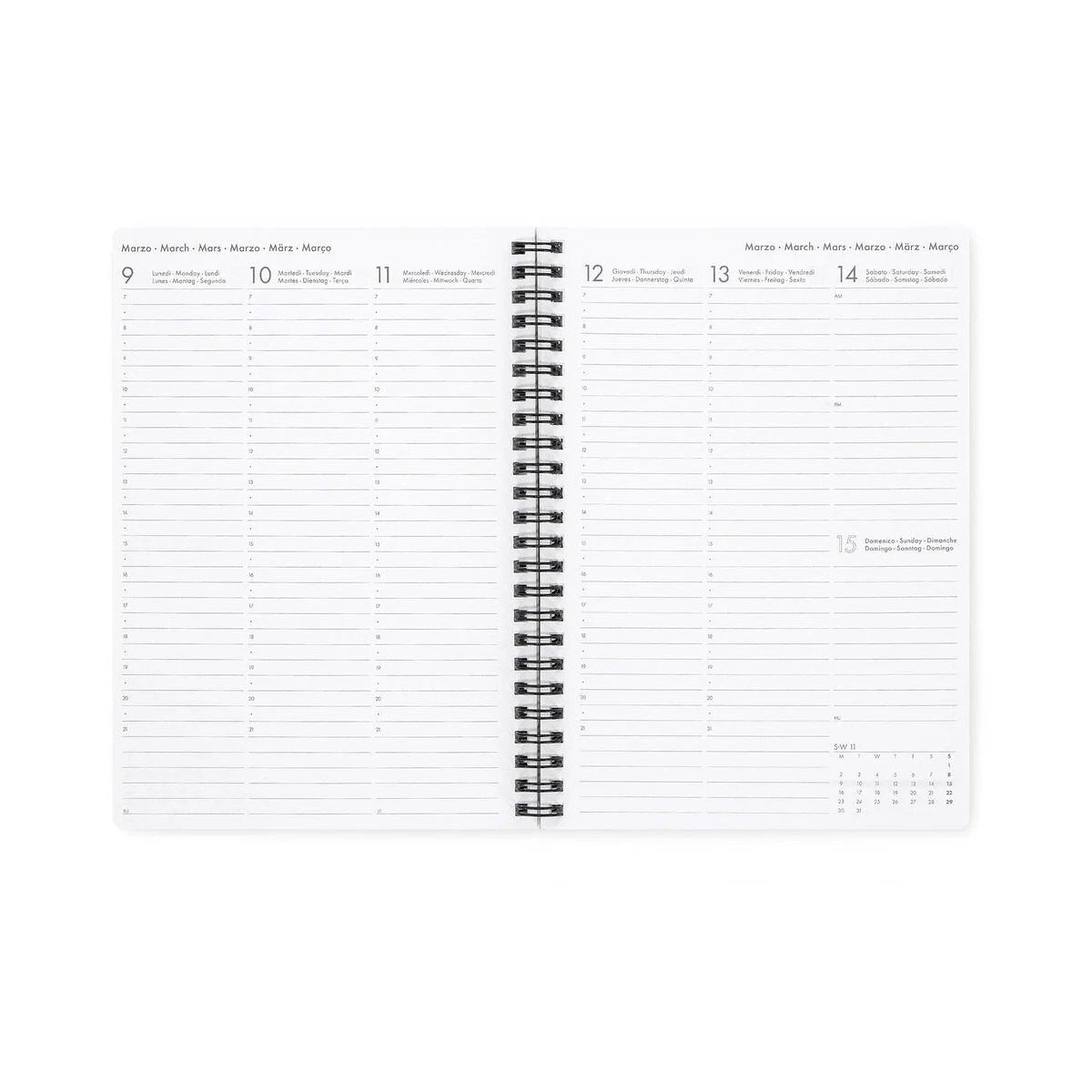 144 páginas, papel branco de 70 g/m², cantos arredondados 6 idiomas (IT, EN, FR, ES, DE, PT) Fusos horários e feriados internacionais Recursos extras: lista de desejos, metas anuais, ideias para presentes, caderno pontilhado e muito mais Agenda dobrável 2026/2027 Agenda de endereços, bolso para documentos em PVC na parte de trás Tamanho: 15 x 21 cm O papel é certificado FSC® (FSC-C154586), proveniente de florestas bem manejadas, florestas certificadas FSC® e outras fontes controladas