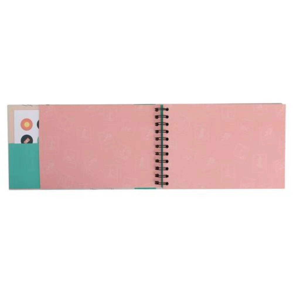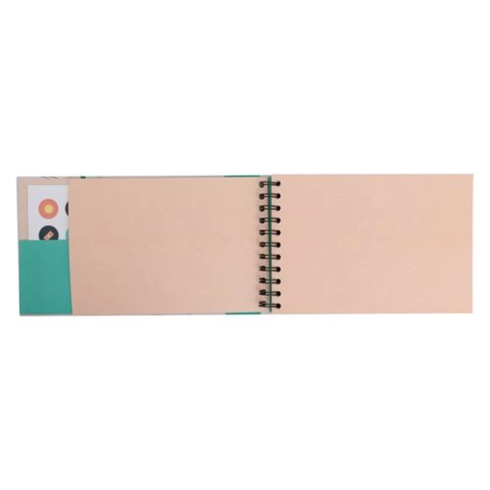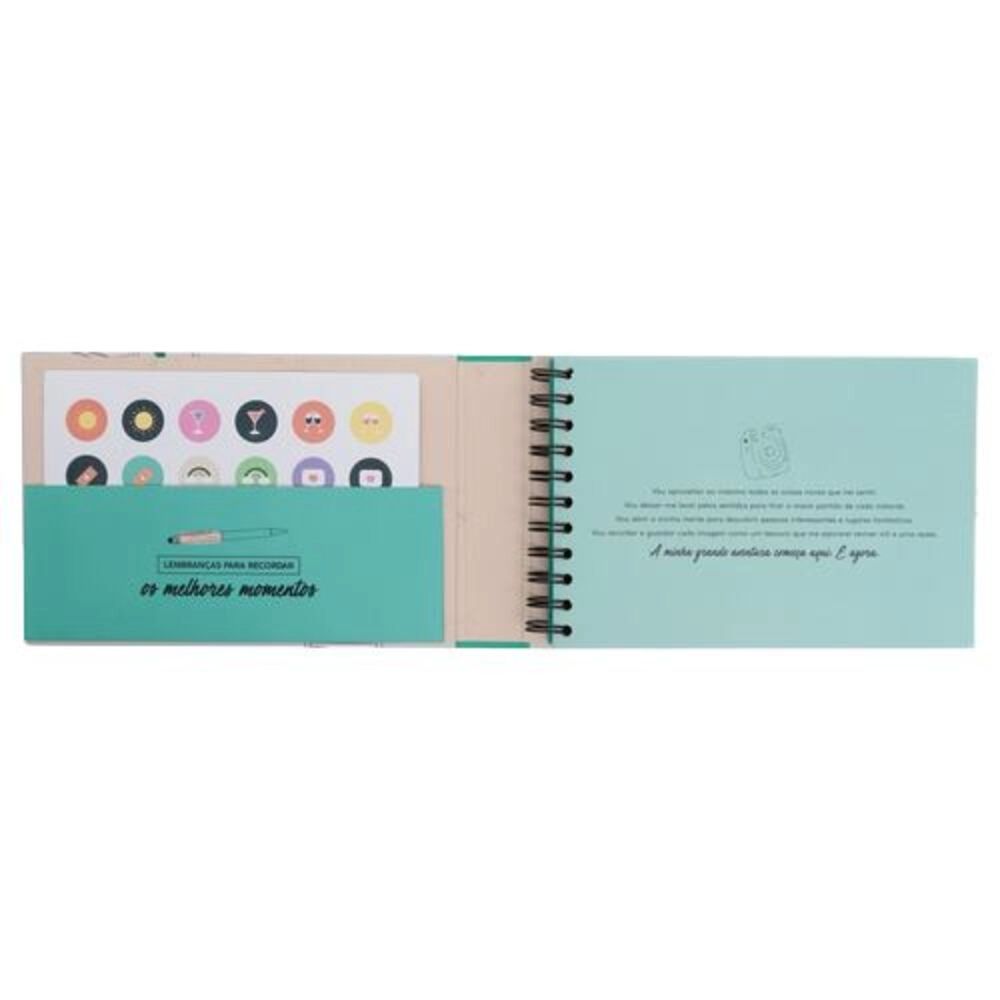 Na página inicial encontramos um texto inspirador relacionado com viagens. Conta com um bolso interior para guardar recordações da viagem, além de 8 folhas de autocolantes.