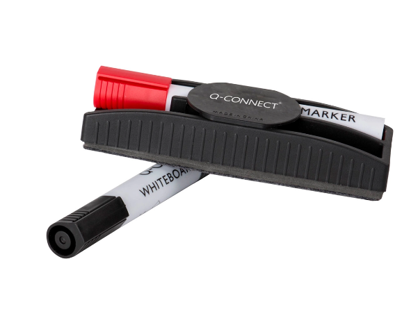 Descrição: Apagador magnético para quadro branco compacto. Fabricado em plástico de cor cinza, dispõe de 2 espaços para colocar os marcadores de quadro. Desliza sem esforços sobre a superfície. Inclui 2 marcadores nas cores preto e vermelho. Medidas: 145 x 27 x 50 mm.