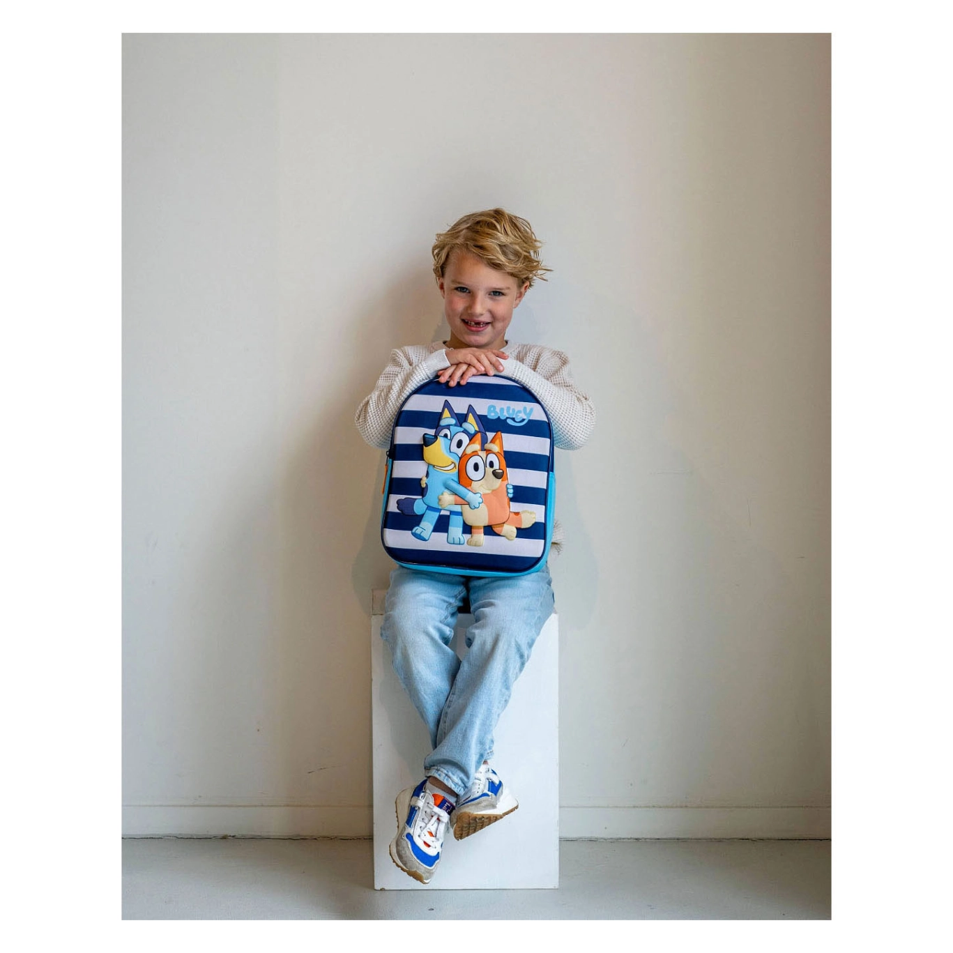 Esta nova mochila 3D da Bluey, da coleção Jump Into Fun, é ideal para começar o ano letivo. A mochila é para crianças que são fãs da Bluey e de suas divertidas aventuras. A peça é azul-claro e possui um amplo compartimento principal com listas azul-escuro e brancas, além de uma imagem grande da Bluey e sua irmã Bingo. A parte de trás é azul-claro. A mochila também possui uma alça prática na parte superior e alças ajustáveis. Além disso, a mochila possui detalhes em azul-escuro.