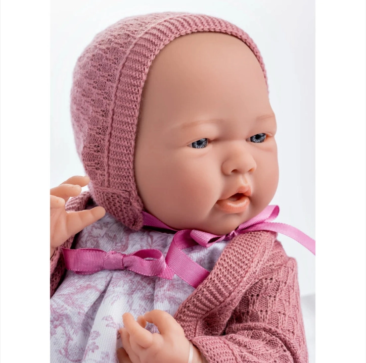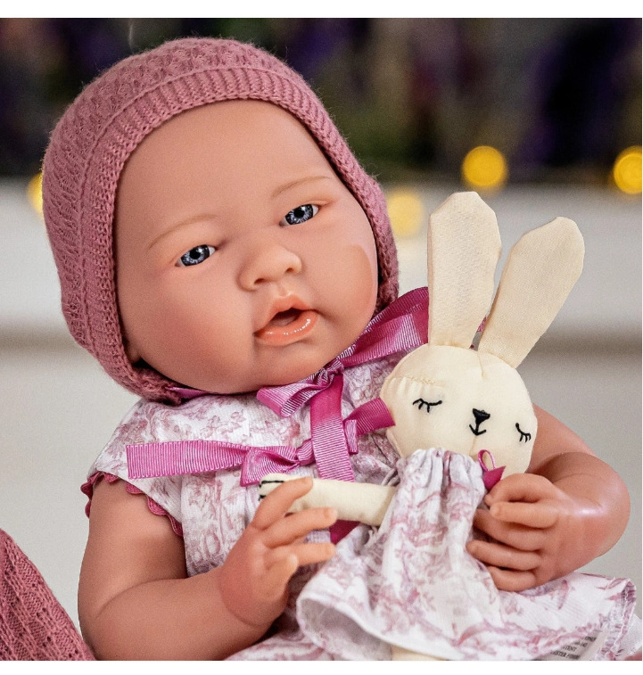 Boneca realista de 38 cm Corpo totalmente em vinil (fácil de limpar) Anatomicamente correta Braços, pernas e cabeça articulados Roupa completa: macacão floral, gorro, casaquinho e sapatinhos Inclui peluche com roupa combinada Olhos azuis e expressão encantadora