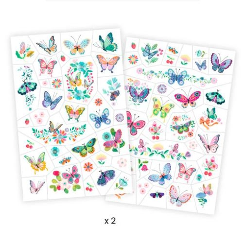 Duas folhas de tatuagens temporárias com cores suaves, claras e cintilantes, como borboletas de sonho! Estão pré-cortadas e são fáceis de usar. Basta transferir usando um pouco de água. Dermatologicamente testado