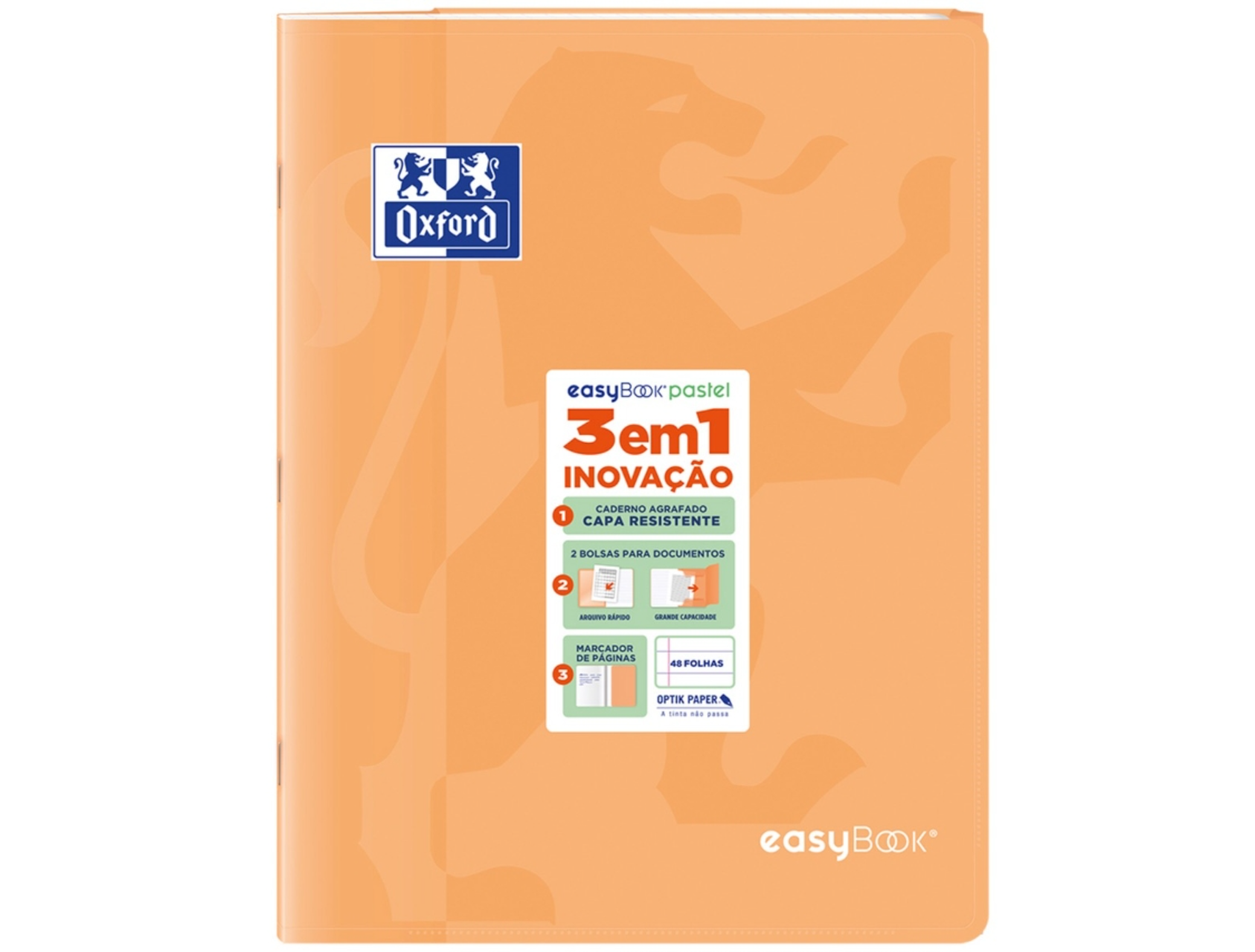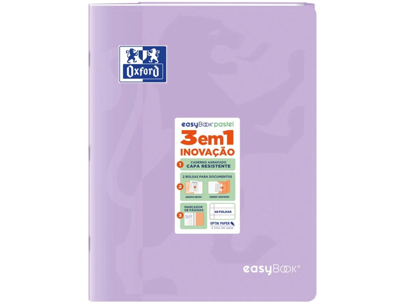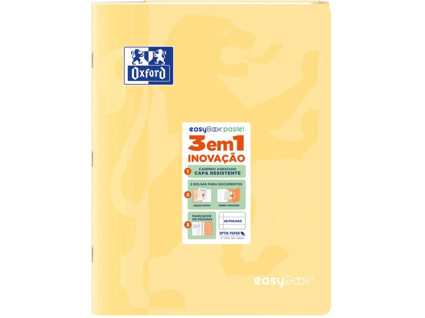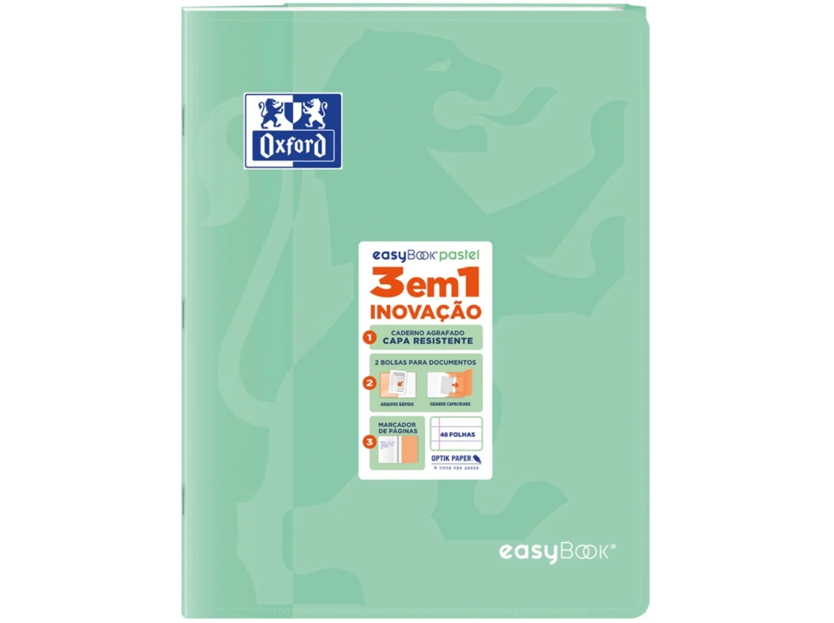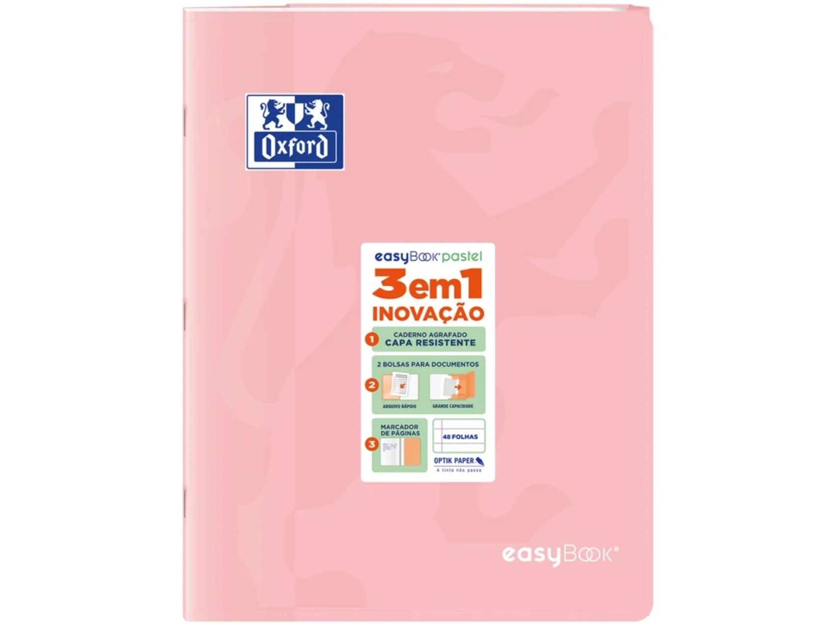 O caderno agrafado EASYBOOK tem tudo que precisas para cada disciplina. Um caderno agrafado 3 em 1 com capas resistentes que inclui: 1 bolsa interna para guardar folhas individuais, pasts de 3 abas no interior do caderno com grande capacidade de arquivo até 80 folhas e uma aba marca-páginas para encontrar rapidamente a folha em que ficou. E tudo com o exclusivo Oxford OptikPaper® pautado. Agora em cores pastel!