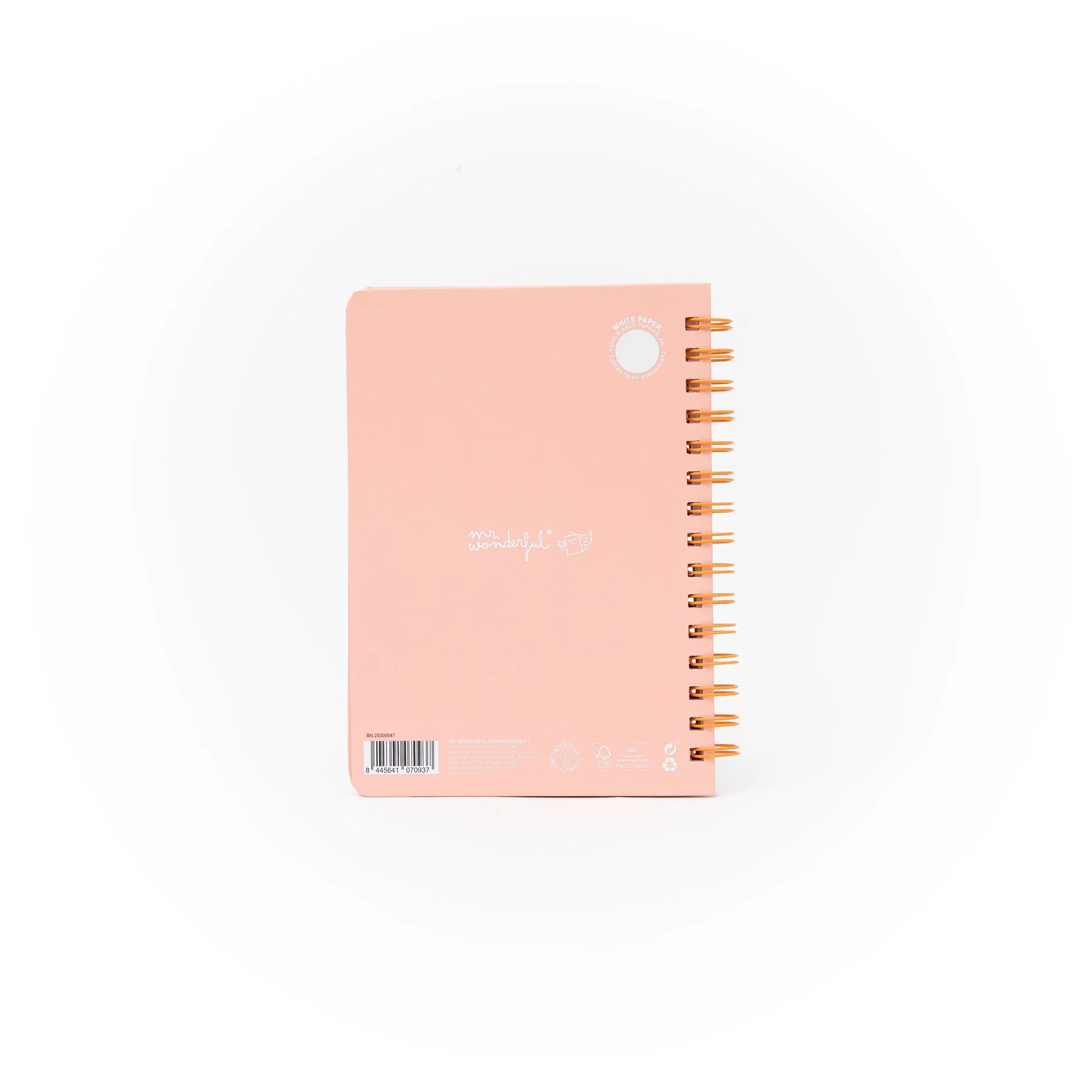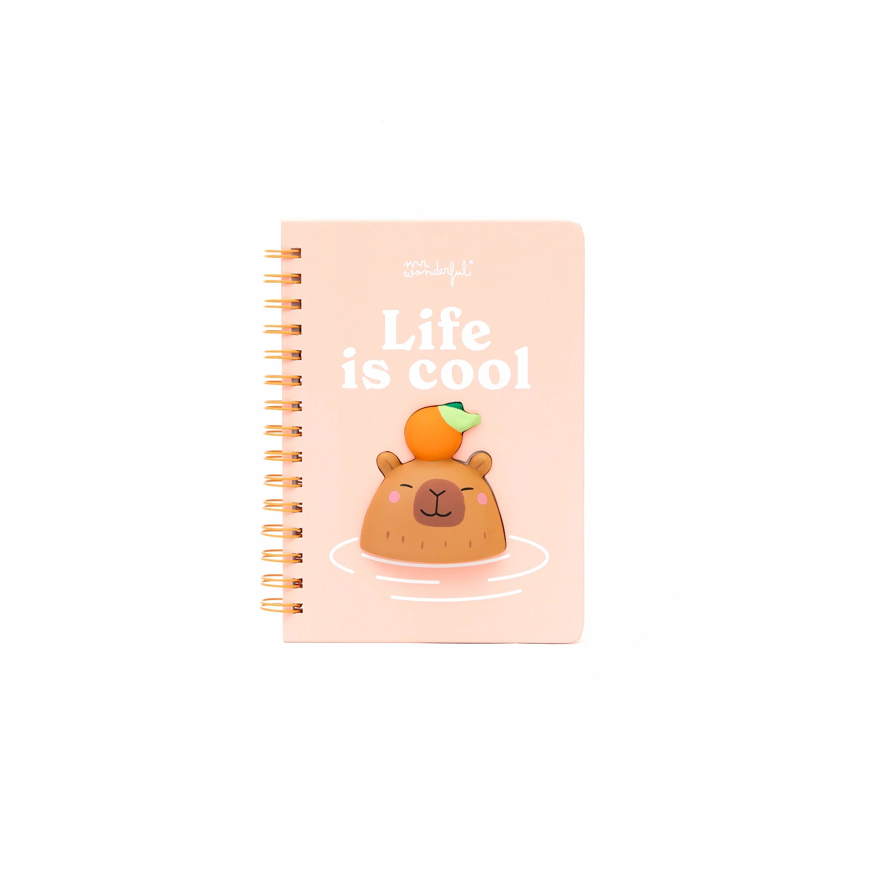 Caderno tamanho A5 com encadernação em espiral, capas duras e um simpático capivara Mr. Wonderful squishy (feito de memory foam) na capa.