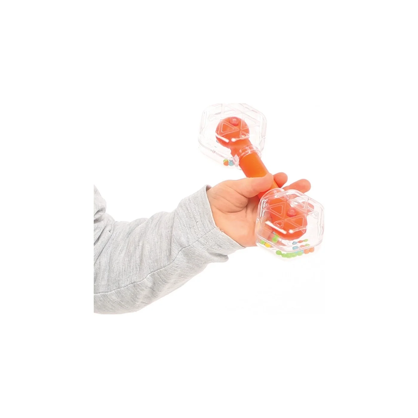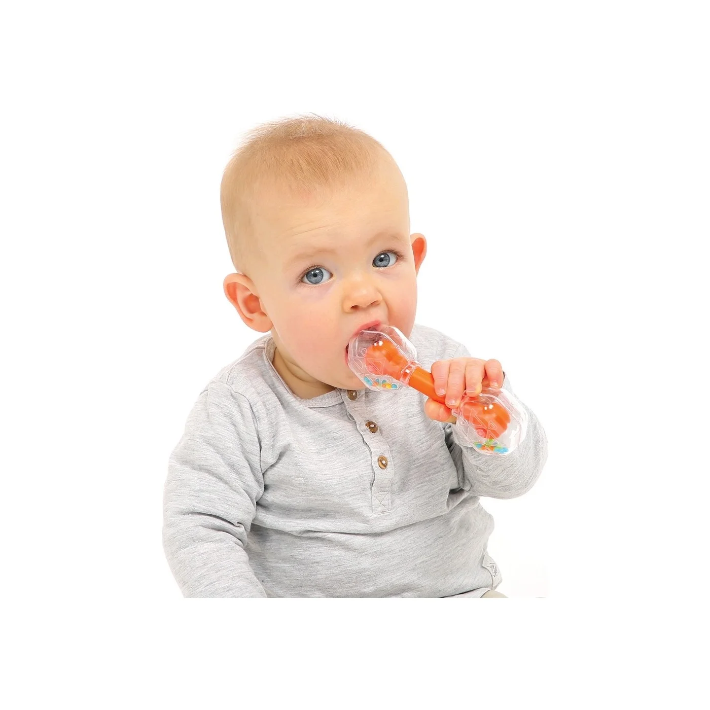 Alivia os dentinhos do bebé que gosta de colocar o brinquedo na boca. Tem uma alça lateral com 3 contas coloridas. O bebé pode divertir-se deslizando-as ou sacudindo-as. Há também 2 instrumentos de percussão! A maraca tem uma dupla cavidade transparente que encerra uma infinidade de pequenas contas coloridas. As crianças adoram ver as pequenas estrelinhas a saltar quando agitam o instrumento!
