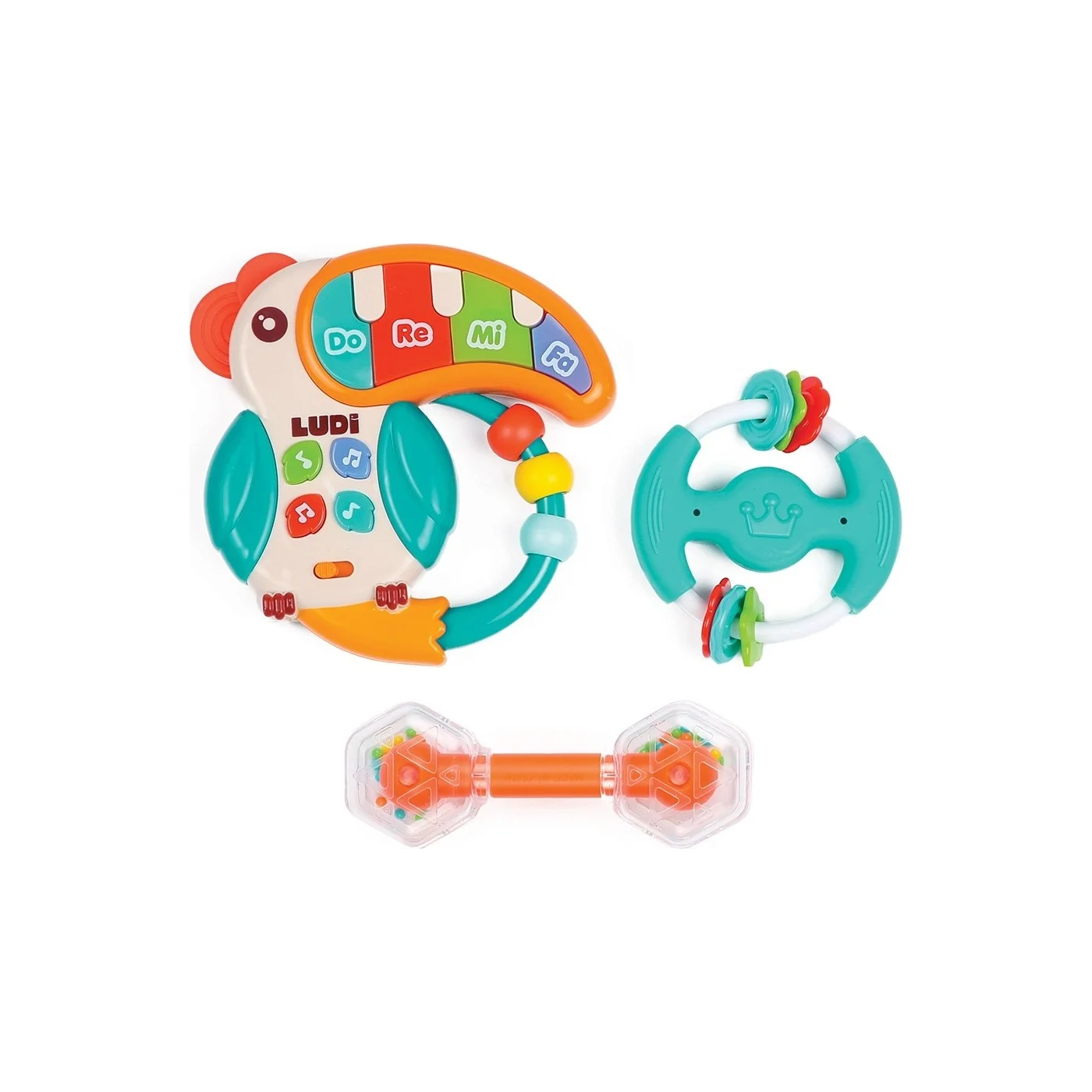 Descubra uma grande caixa para despertar as crianças para a música! O maestro tucano marca o ritmo! No seu bico, um teclado de piano (dó, ré, mi, fa) permite que as crianças componham as suas primeiras melodias. Na barriga, 4 pequenas notas oferecem muitas canções de embalar. As teclas são animadas por uma bonita luz. Na sua cabeça, a crista do tucano é feita de silicone flexível e macio.