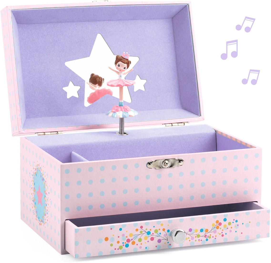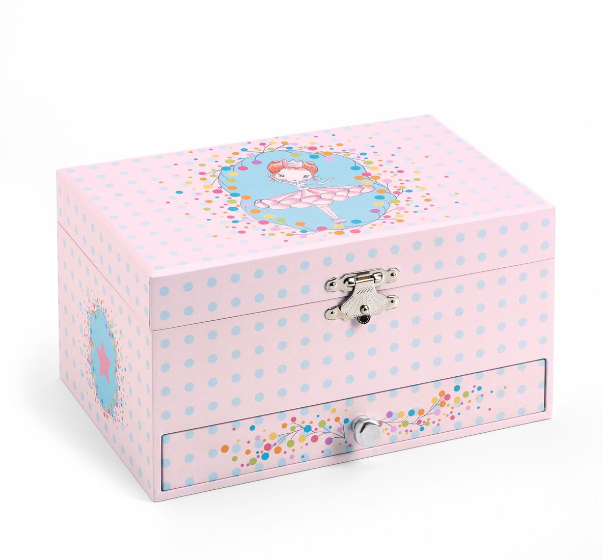 Caixa de jóias musical! Gira a manivela, abre a caixa e ela ganha vida! Em madeira, veludo, plástico e metal. Indicado para + de 4 anos.A música dura aproximadamente 2:30 minutos. 17,8 x 11,7 x 9,9 cm. Caixa: 18,2 x 13,4 x 10,3 cm. Música "Invitation to the Dance", de Carl Maria von Weber.