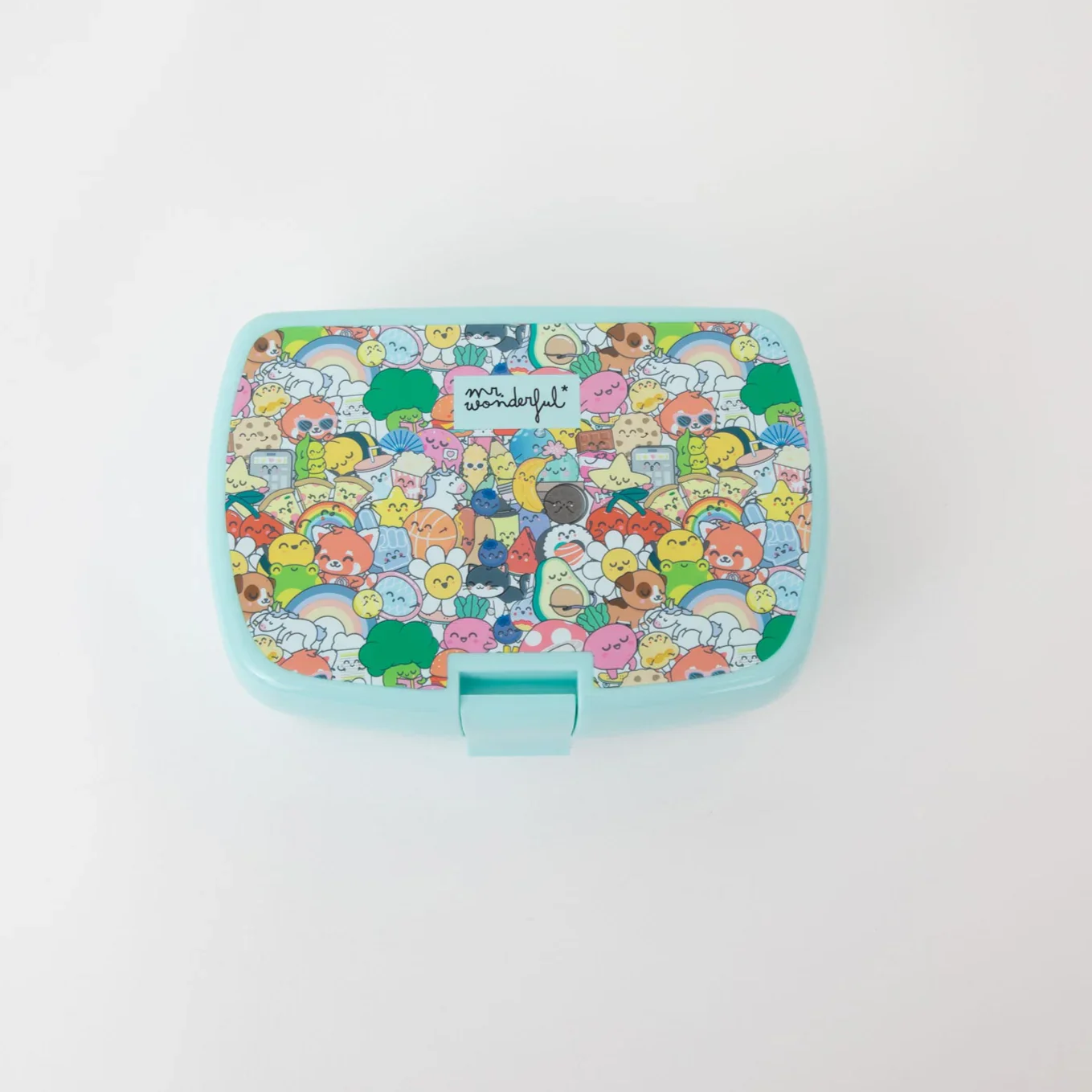 Lancheira de plástico sem BPA e adequada para uso alimentar, ideal para transportar alimentos. Com um bonito design Mr. Wonderful, é muito prática. Cumpre todas as normas alimentares da União Europeia. O produto inclui uma folha de autocolantes para personalizar a lancheira com o nome do proprietário ou proprietária.