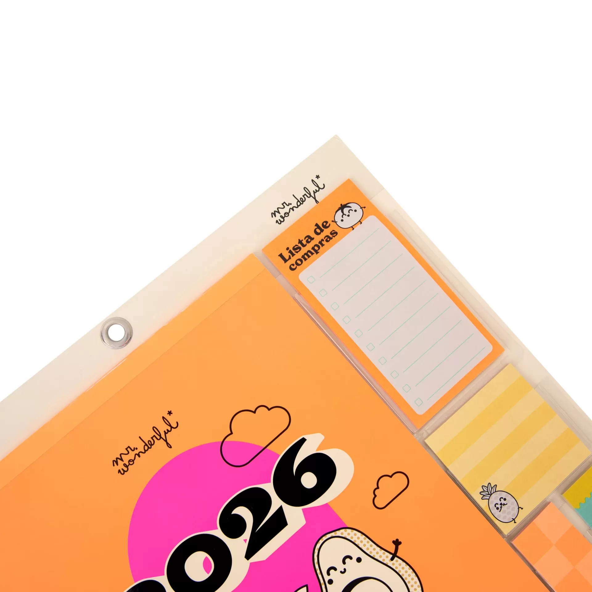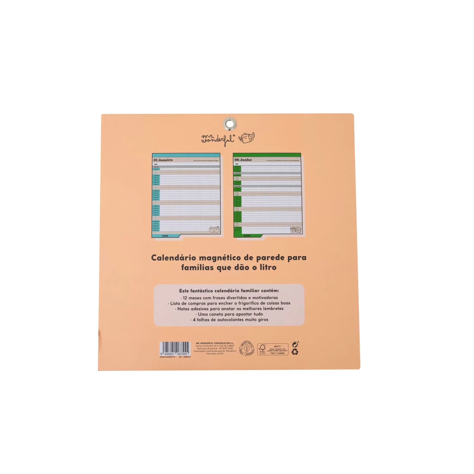 Calendário familiar para pendurar na parede ou no frigorífico, com fundo magnético que permite fixá-lo na porta do frigorífico ou pendurá-lo na parede. Todos os meses, há colunas para anotar o nome de cada membro da família na parte superior e anotar as suas tarefas ou compromissos abaixo. Inclui ainda uma frase motivacional para cada mês do ano, 4 folhas autocolantes, 1 caneta, 1 bloco de notas autocolantes e 1 bloco de notas para a lista de compras.