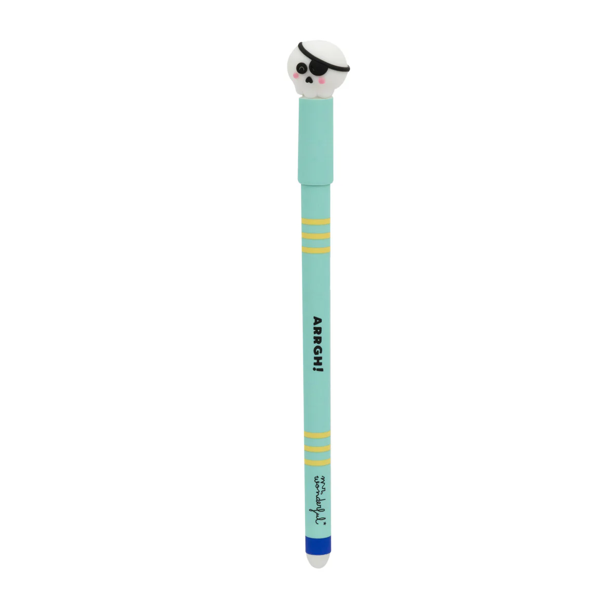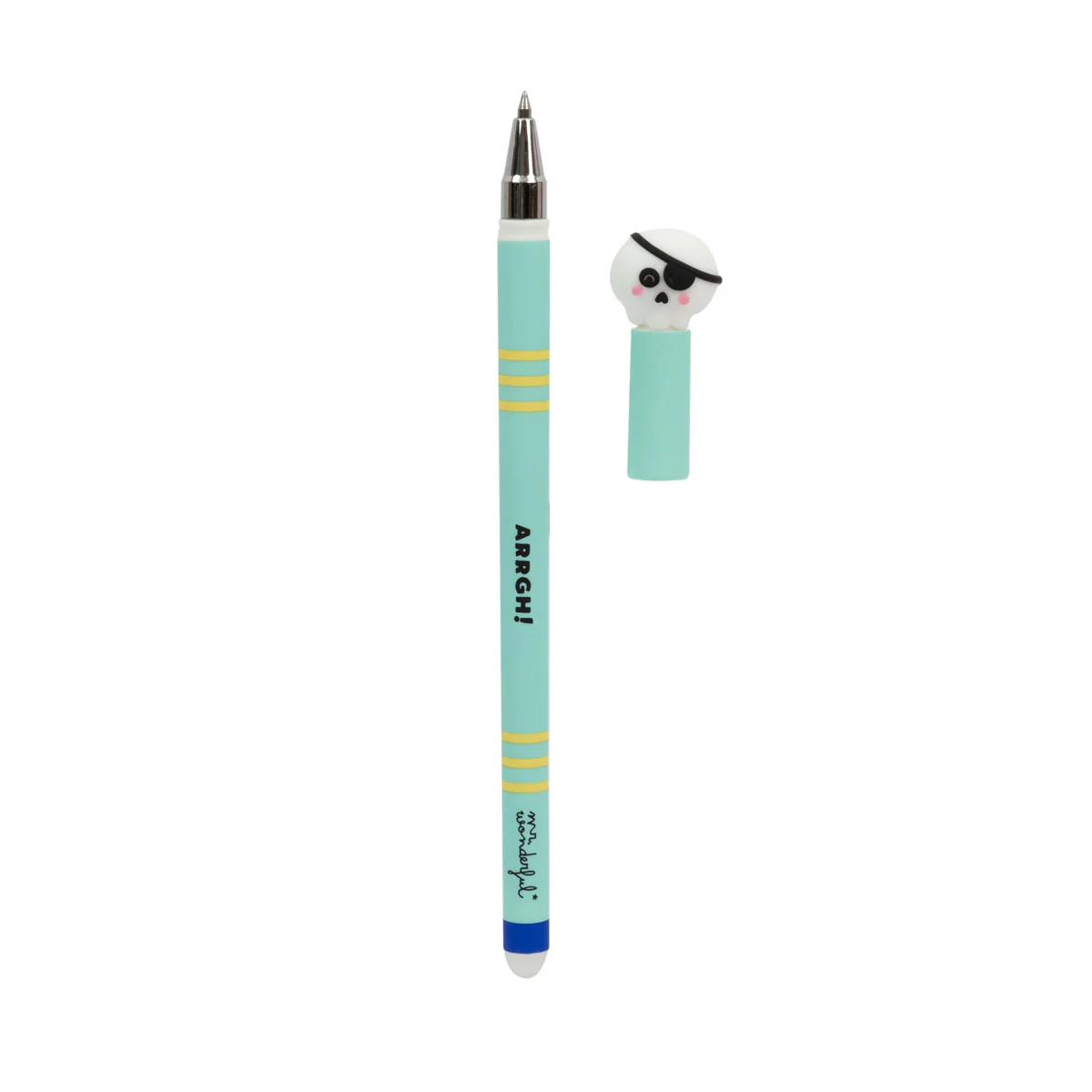 Caneta apagável Bo-Bo com a divertida caveira pirata Mr. Wonderful em uma ponta.Na extremidade oposta encontramos uma borracha capaz de apagar a tinta da caneta.