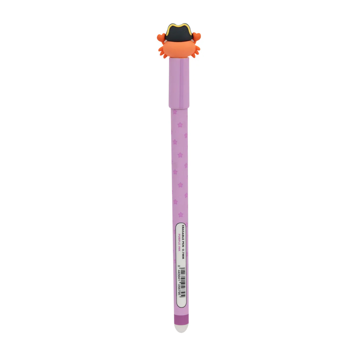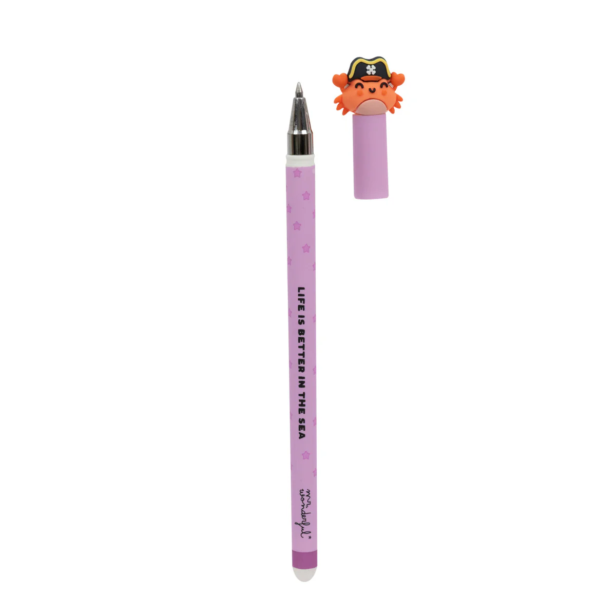 Caneta apagável Bo-Bo com um divertido caranguejo pirata Mr. Wonderful em uma ponta.Na extremidade oposta encontramos uma borracha capaz de apagar a tinta da caneta.
