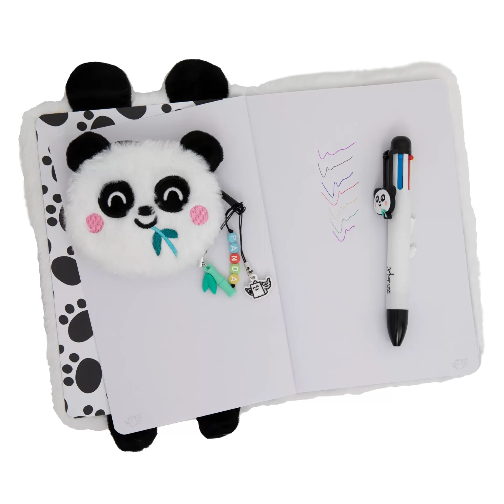 Conjunto apresentado num pack de oferta, composto por um caderno A5 com encadernação cosida, revestido de peluche (feito de poliéster) e com a forma e as cores de uma personagem divertida da Mr. Wonderful. Inclui também um pequeno porta-moedas de peluche de poliéster, com fecho de correr e com a forma da mesma personagem, além de uma caneta apagável multicolor (6 tintas). O caderno tem 160 páginas brancas e certificação FSC, garantindo que foi fabricado com papel proveniente de florestas geridas de forma responsável.