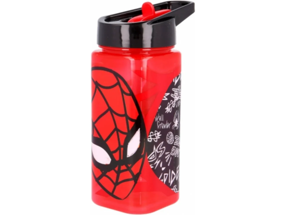 Garrafa do famoso super-herói Spiderman. A cor principal é vermelha e tem toda a superfície com impressões. Sua capacidade é de 530 mililitros. Fecha com uma tampa de rosca e tem um bocal automático. Este produto licenciado é oficial e 100% original.