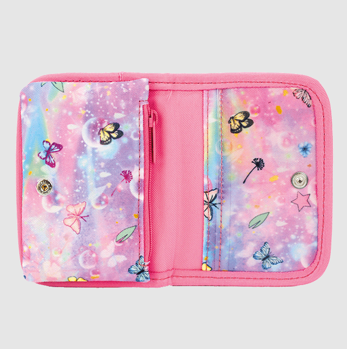 Com compartimento para cartões e passe escolar, porta-moedas e porta notas.