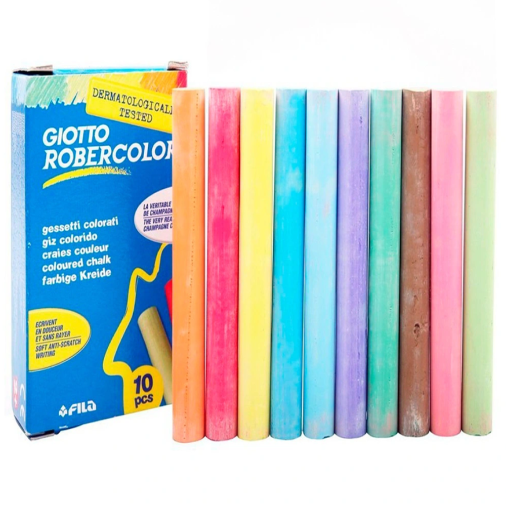 Descrição: Giz Giotto Robercolor - caixa com 10 cores. Para quadros. Giz de forma cilíndrica antipó, não mancha. Graças à sua forma antipó, estão recomendados para crianças com problemas asmáticos. Sem glúten.