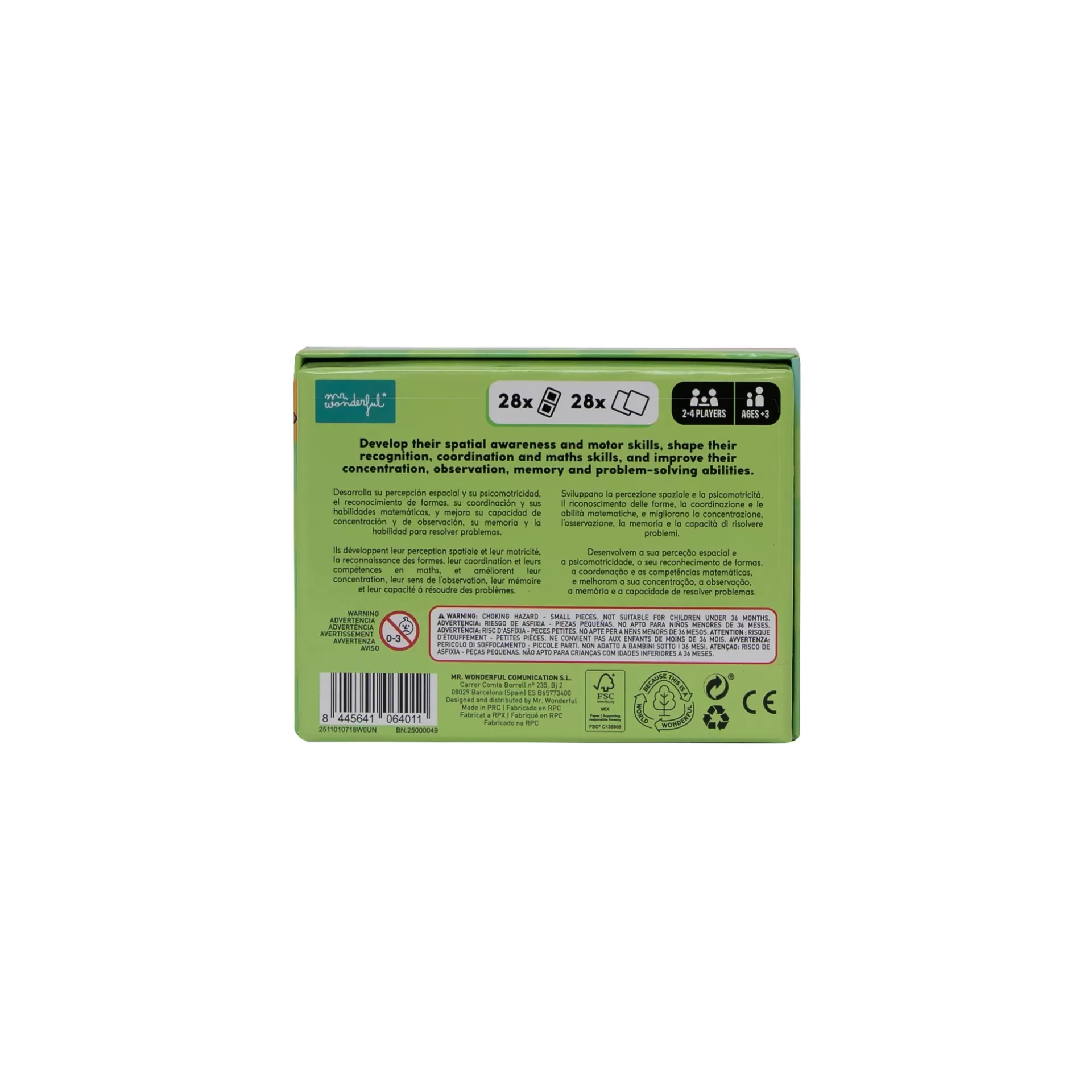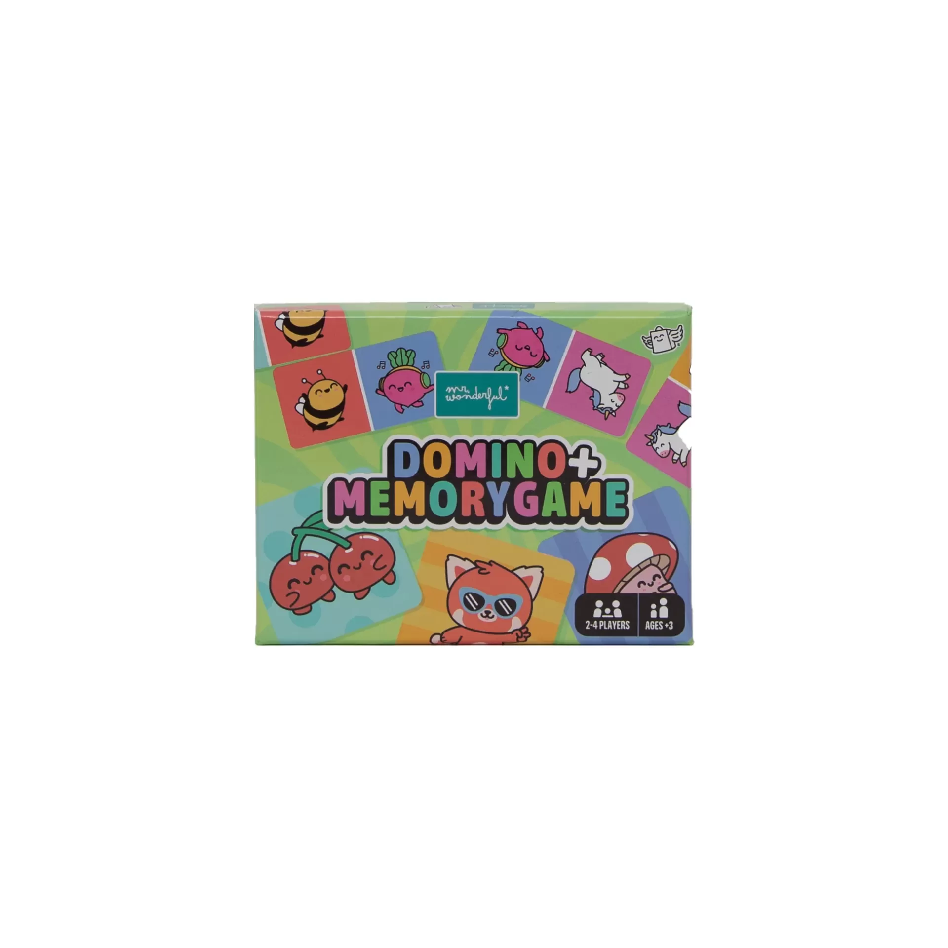 Dois jogos em um, projetados para crianças acima de 3 anos: de um lado, um jogo de dominó com 36 peças com personagens Mr.Wonderful e, do outro, um jogo da memória com 30 peças, também com personagens da marca.