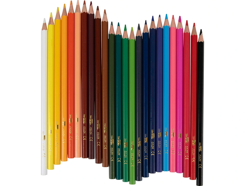 Descrição: Caixa com 24 lápis de cor. Cores intensas. Ideais para uso escolar. Mina extra resistente. Escrita suave e uniforme. Caixa de cartão plastificada.