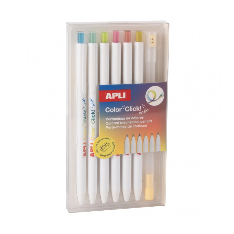 Conjunto de lápis mecânicos coloridos Color Click Mix. Os lápis mecânicos coloridos Color Click Mix reinventam a experiência de colorir graças à sua mina multicolorida, capaz de criar traços dinâmicos e efeitos degradê surpreendentes a cada uso. Colorir atinge uma nova dimensão criativa, onde um único lápis mecânico oferece múltiplas cores em cada linha.