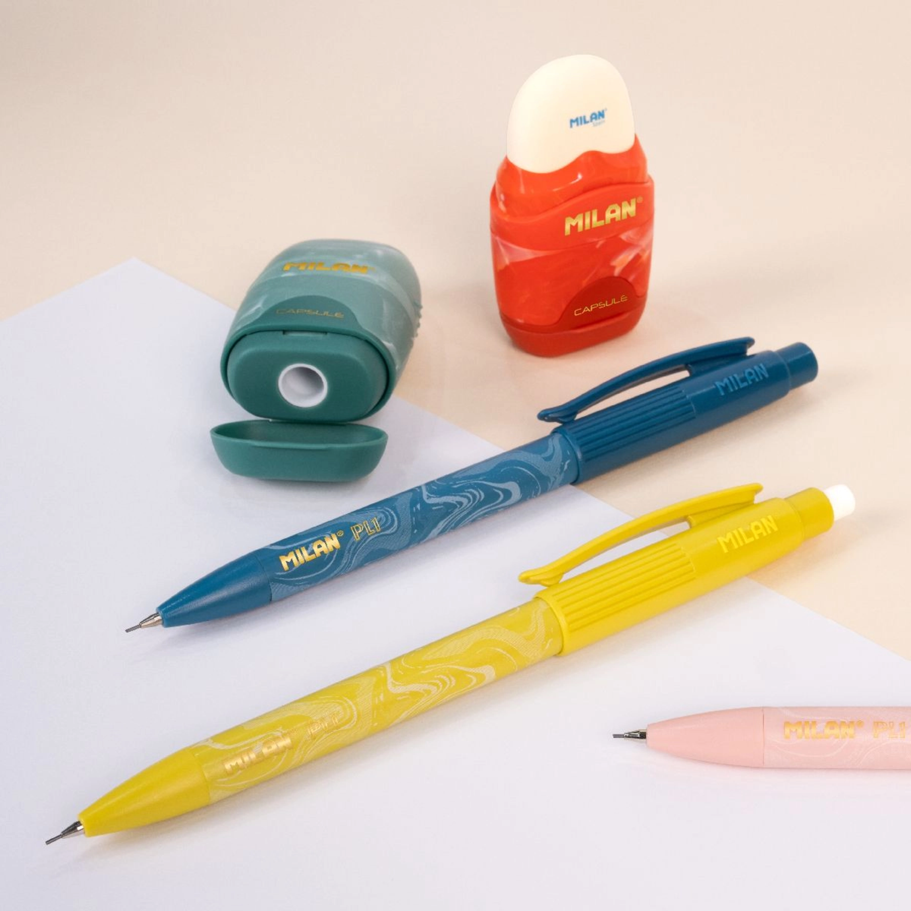 Lápis mecânico com borracha e borracha da série Lava PL1, inspirado em erupções vulcânicas e no movimento de rochas derretidas. Mina de grafite HB de 0,5 mm para traços finos. Borracha MILAN extra longa com mecanismo giratório. Design original criado pelo departamento de P&D.