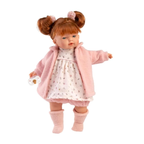 Boneca de corpo macio, com 33 cm. A cabeça, braços e pernas são de vinil, agradável ao toque. Quando perde a chupeta, chora e diz mamã e papá. Pilha: RL - 44. Roupa 100% Algodão - lavar com água fria. Feita à mão em Espanha.