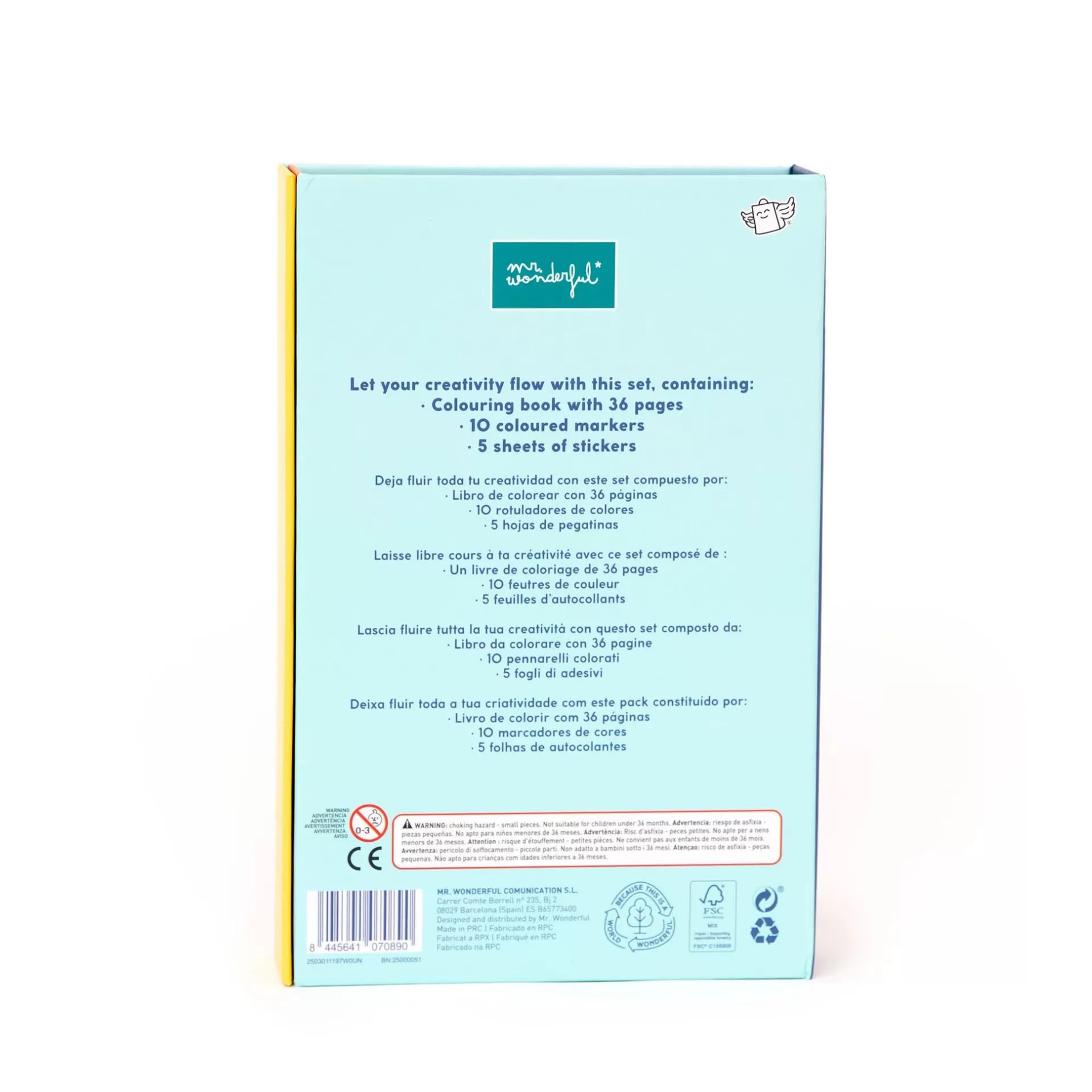 Pasta rígida que, ao ser aberta, revela um livro de colorir para crianças, com 72 páginas cheias de silhuetas de personagens Mr. Wonderful, colado no interior. Inclui também 10 marcadores de cores e 5 folhas de autocolantes.