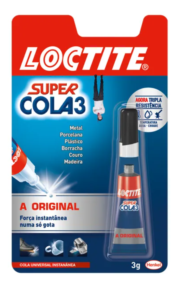 Loctite Super Cola3 Original possui a máxima força de união, colando em poucos segundos qualquer tipo de material: PORCELANA, MADEIRA, PLÁSTICO, METAL, BORRACHA, COURO, MÁRMORE …