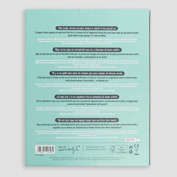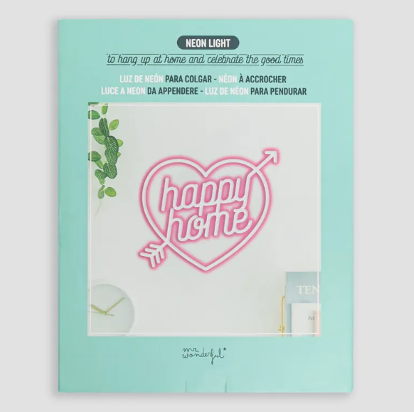 Luz de néon para pendurar, com uma mensagem caseira e muito wonder. Pode pendurar-se tanto em paredes como em portas. O candeeiro foi fabricado em metacrilato e tem luzes LED. Liga-se à eletricidade através uma entrada USB (não inclui o adaptador à corrente, nem os parafusos para a sua fixação).
