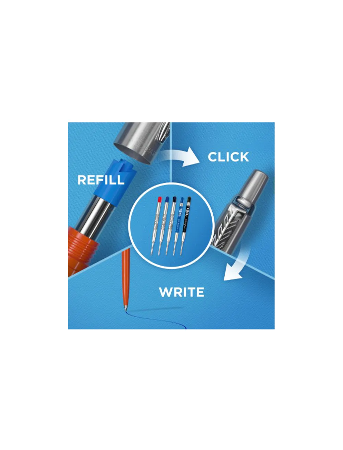 A parte colorida de plástico é agora de metal polido, o clip de bolso foi redesenhado e agora há mais cores para escolha! Retrátil, inclui carga original Parker de escrita média na cor azul.
