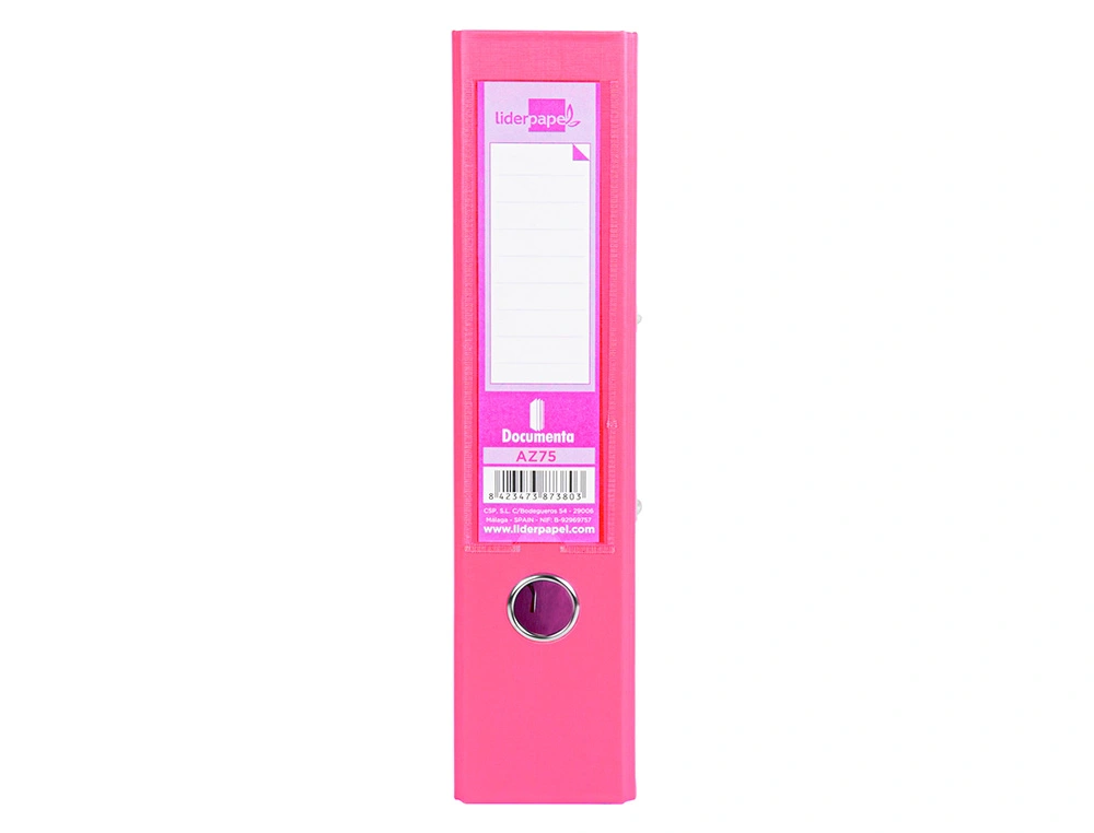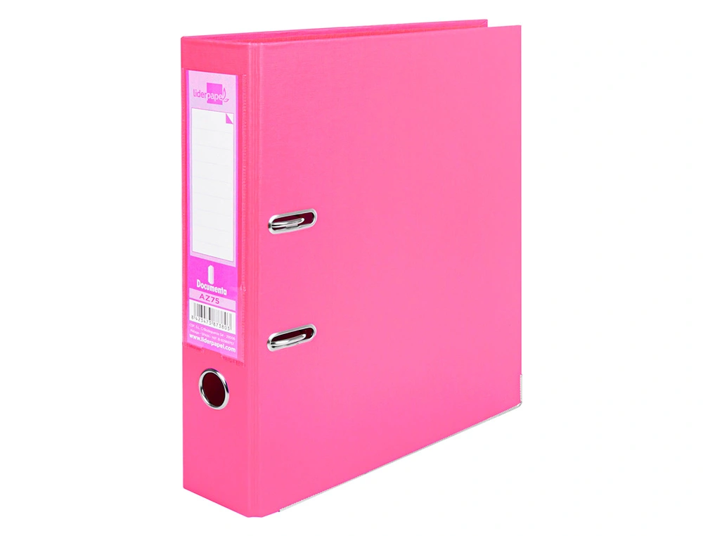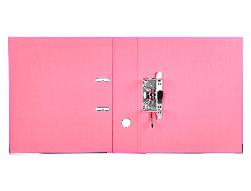 Descrição: Pasta de arquivo A4 em cartão, forrada em pvc. Ferragem de alavanca e compressor niquelado. Calha e porta etiqueta na lombada 75 mm. Cor rosa.