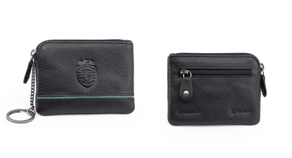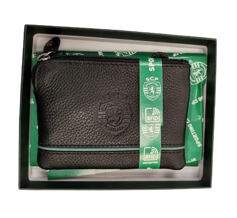 Porta Moedas em Bolsa Preta de Pele e Linha Verde – SCP, artigo original com selo a certificar o produto oficial do Sporting Clube de Portugal. O material em pele, bem como o espaço para moedas tornam esta carteira preta com linha verde única.