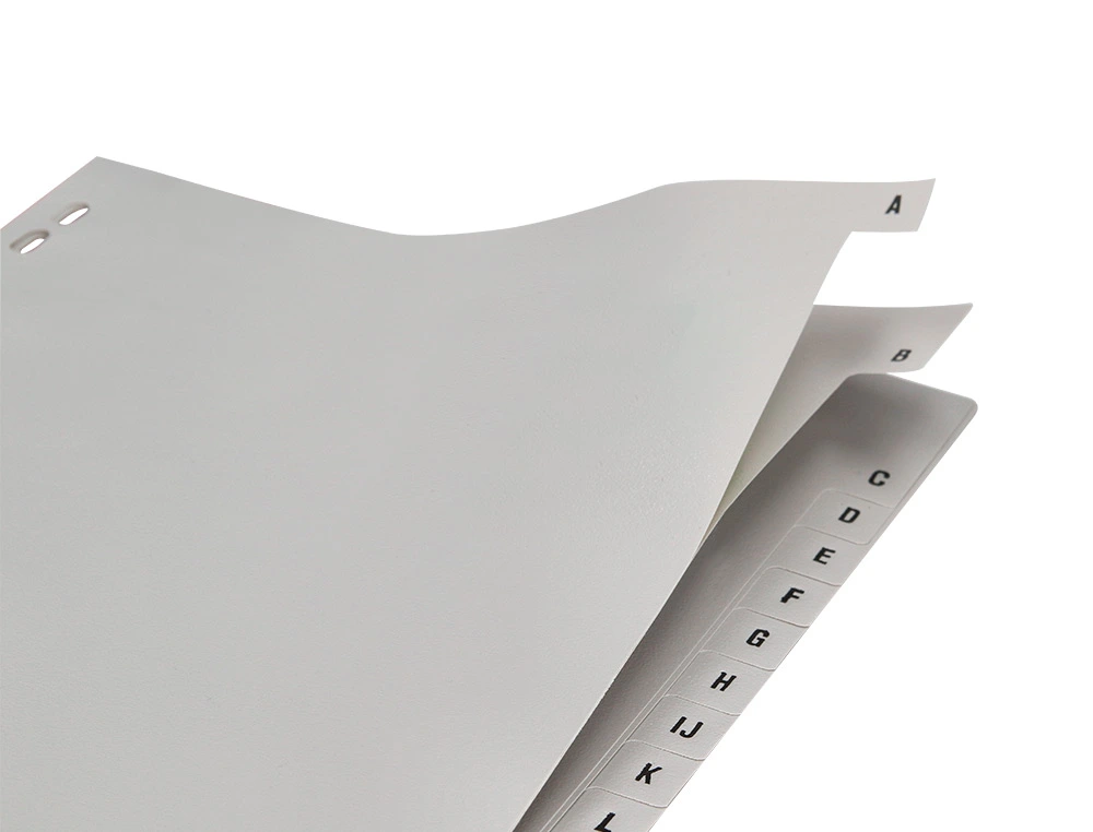 Descrição: Separadores alfabéticos A-Z de plástico A4. Fabricados em pvc, na cor cinza, formato A4. Multiperfurados para classificação e ordenação alfabética de documentos. Gravação do alfabeto nas pestanas ou separadores.
