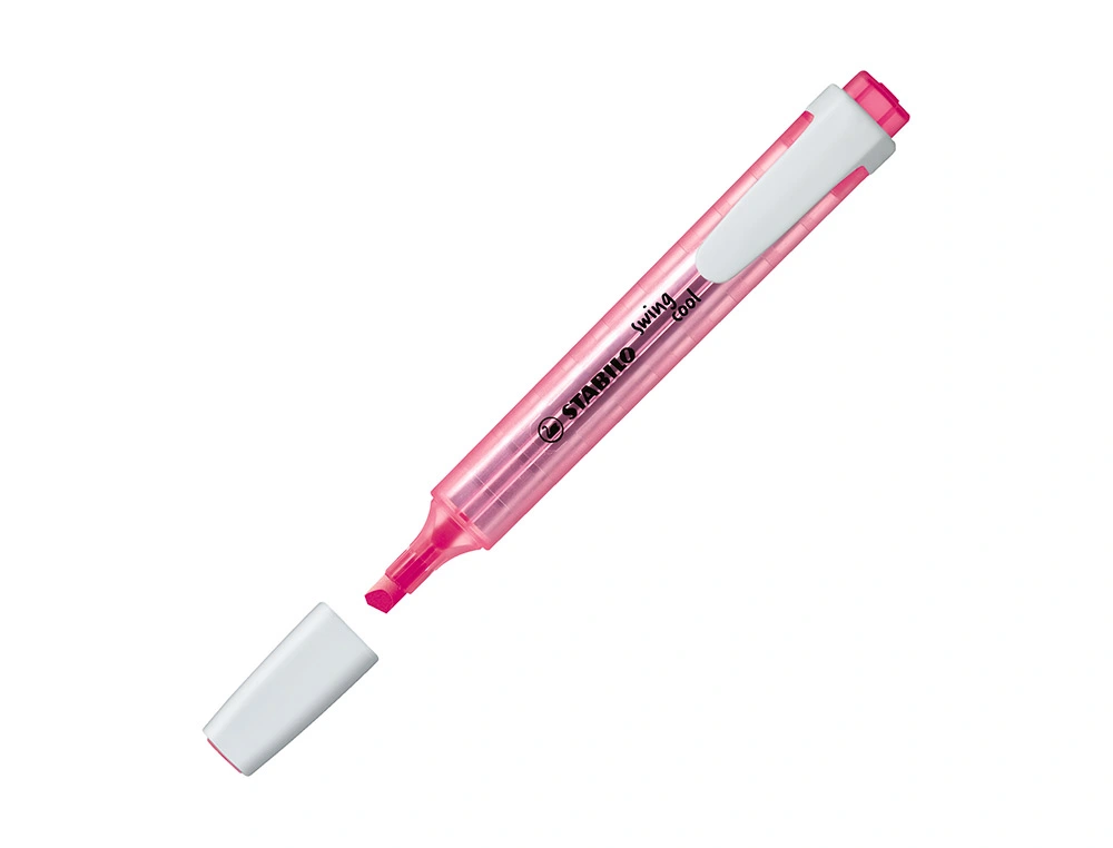 Descrição: Marcador fluorescente Stabilo Swing Cool rosa. Grande fluorescencia desde o inicio até ao fim. Tinta à base de água, resistente à luz em todo tipo de papel: normal, fax, fotocópia, etc. Tampa ventilada. Ponta biselada.