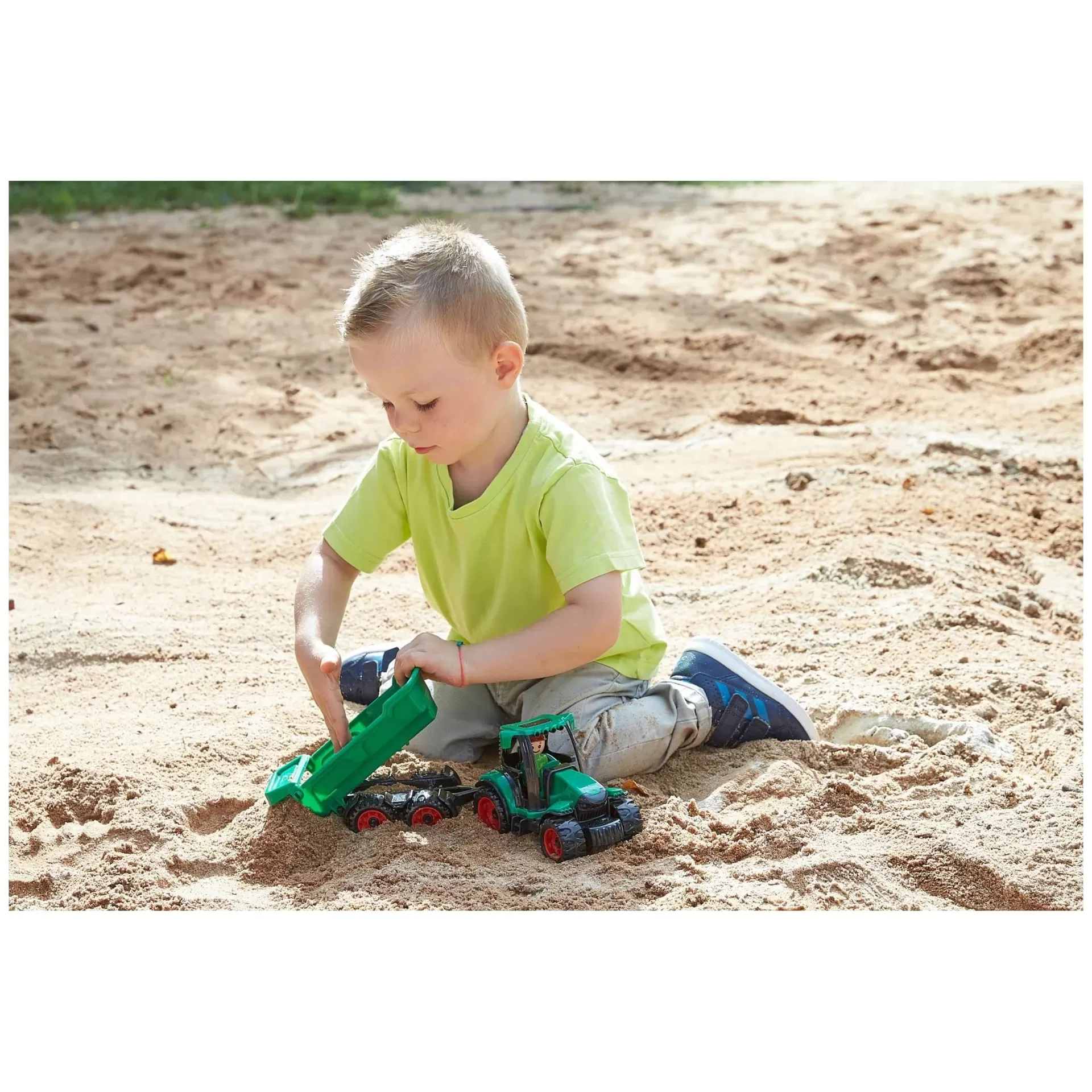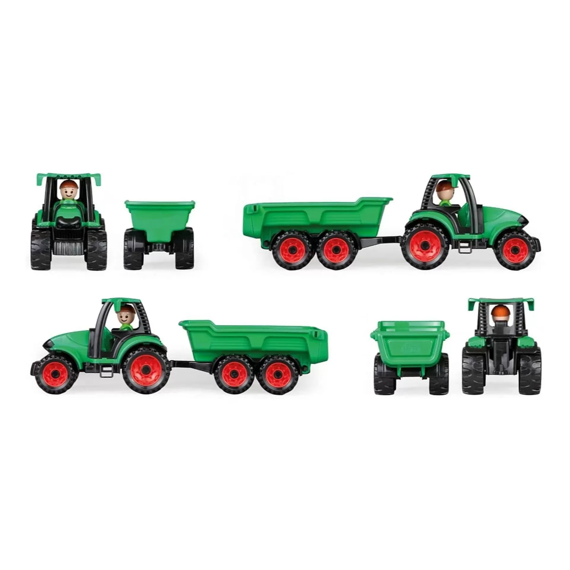 Percorre a tua fazenda com o teu novo trator com reboque. Estaciona-o e enche o reboque com os teus cultivos! Agora, és um agricultor! Tem eixos de aço galvanizado. A cabine do motorista pode ser aberta. O reboque é basculante e desmontável. Inclui boneco. Podes brincar dentro de casa ou no exterior.
